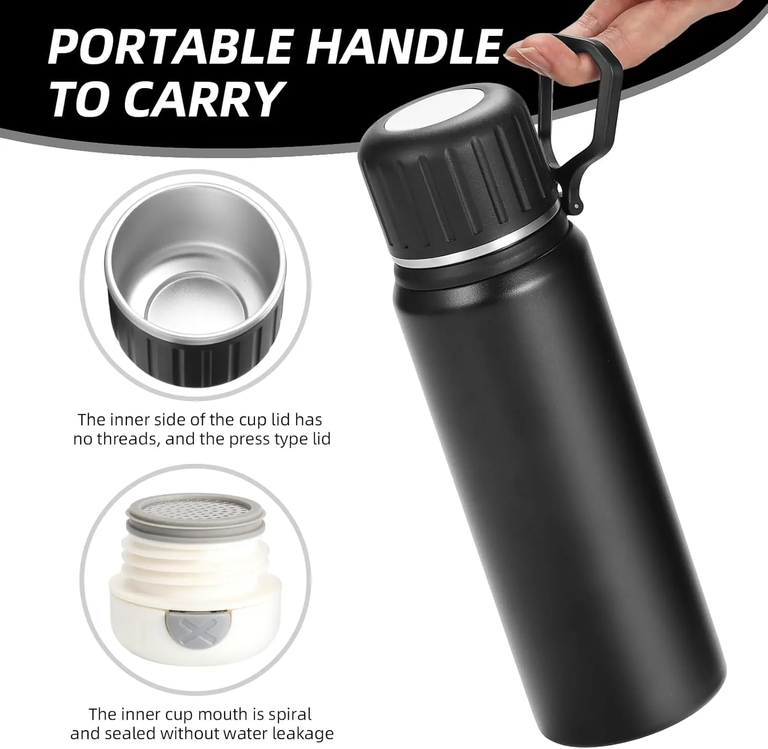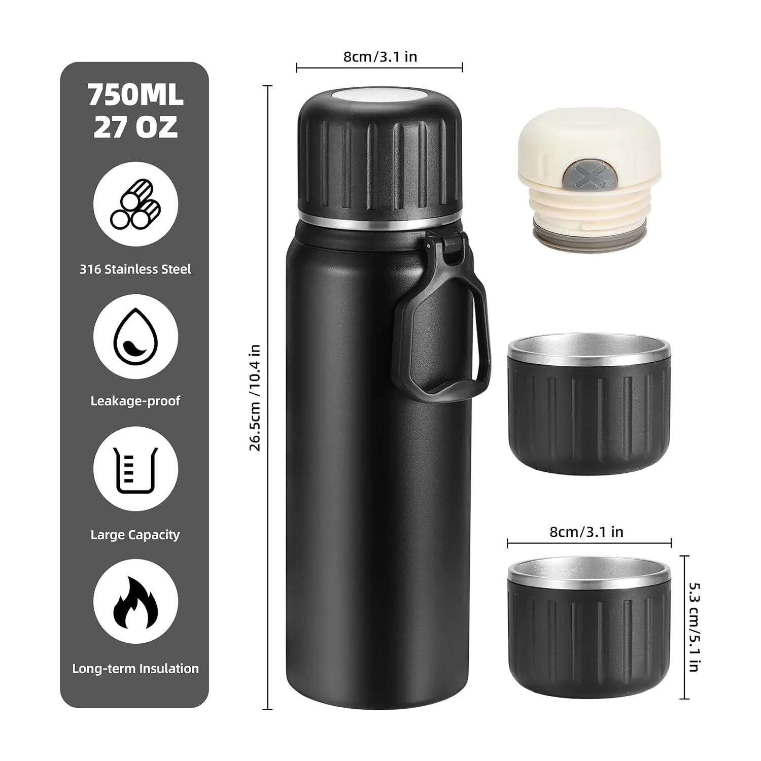 This 27 oz/750ml 24-hour hot insulation water bottle set is designed for B2B wholesale buyers, featuring a stainless steel vacuum flask, 3 reusable cups, and replaceable inner caps/silicone rings. Ideal for distributing as premium drinkware, the set combines functionality with gift-ready packaging, including a greeting card for personalization. Crafted from food-grade 304 stainless steel, this insulated water bottle set ensures durability for bulk orders, catering to retailers, corporate gift suppliers, and outdoor gear wholesalers seeking reliable, long-lasting hydration solutions.