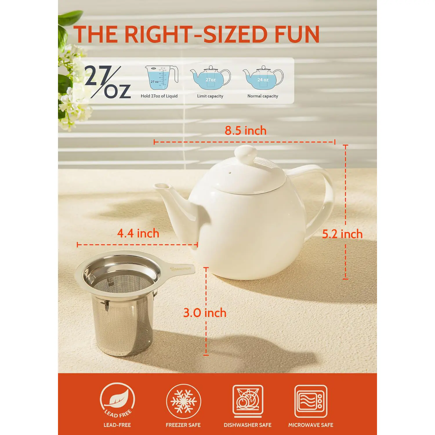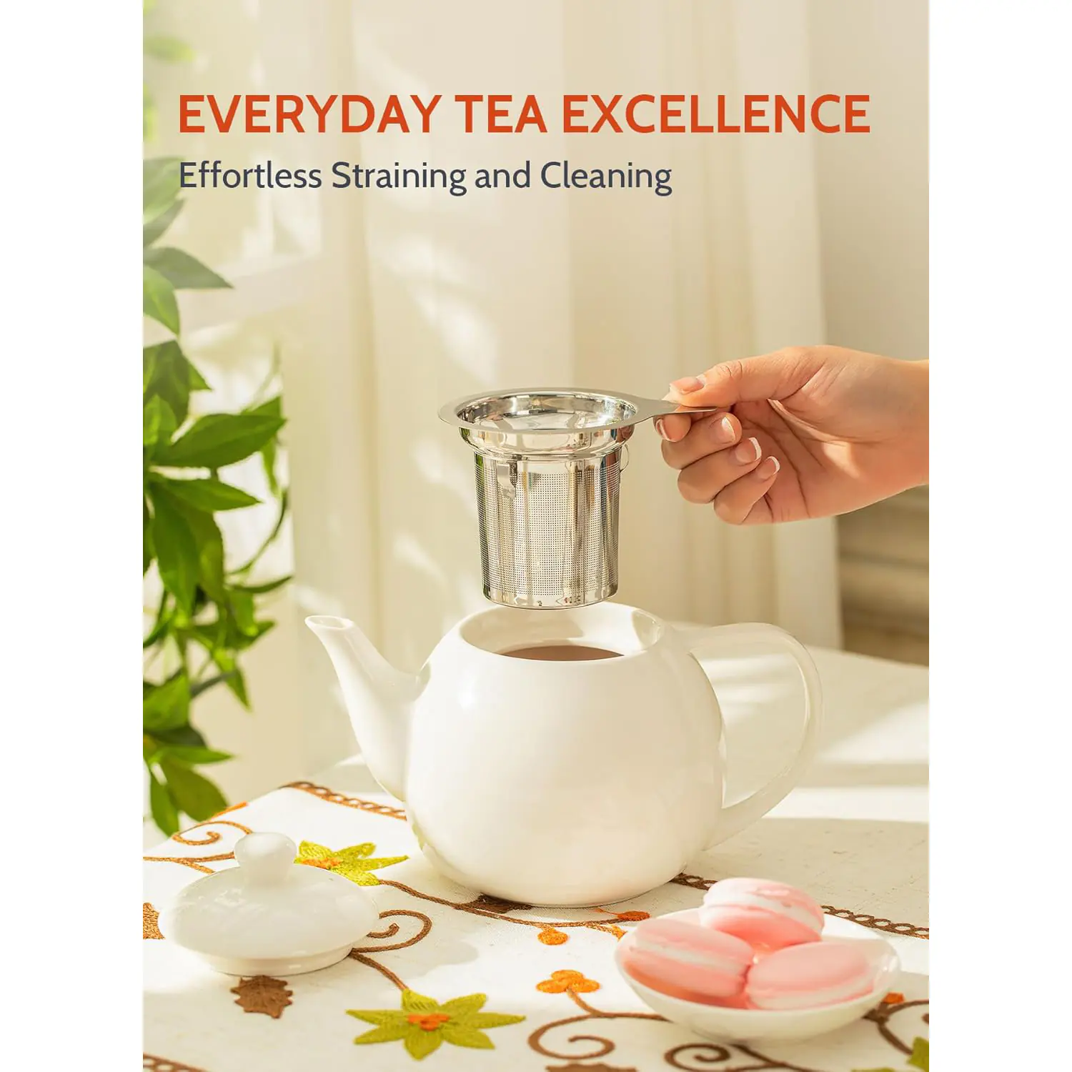 Crafted from high-quality, lead-free ceramic, this teapot is durable, chip-resistant, and retains heat well. The stainless steel infuser allows loose tea leaves to circulate freely for optimal flavor. A tight-fitting lid with silicone gasket ensures a drip-free pour. The ceramic teapot’s ergonomic handle and smart thumb-hold infuser design enhance comfort and control during serving, making it a user-friendly addition to your teaware collection.