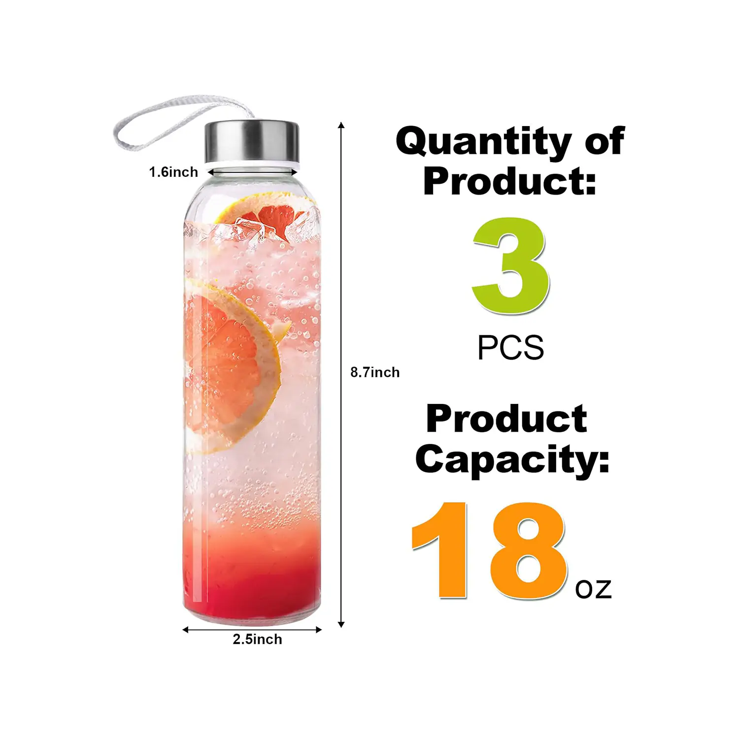 This 3-pack of 18oz Glass Water Bottles offers a reusable, eco-friendly solution for storing a wide range of beverages including juice, iced tea, smoothies, and infused water. Each bottle is ergonomically designed for a comfortable grip, ideal for daily hydration needs at home, work, or on the go.