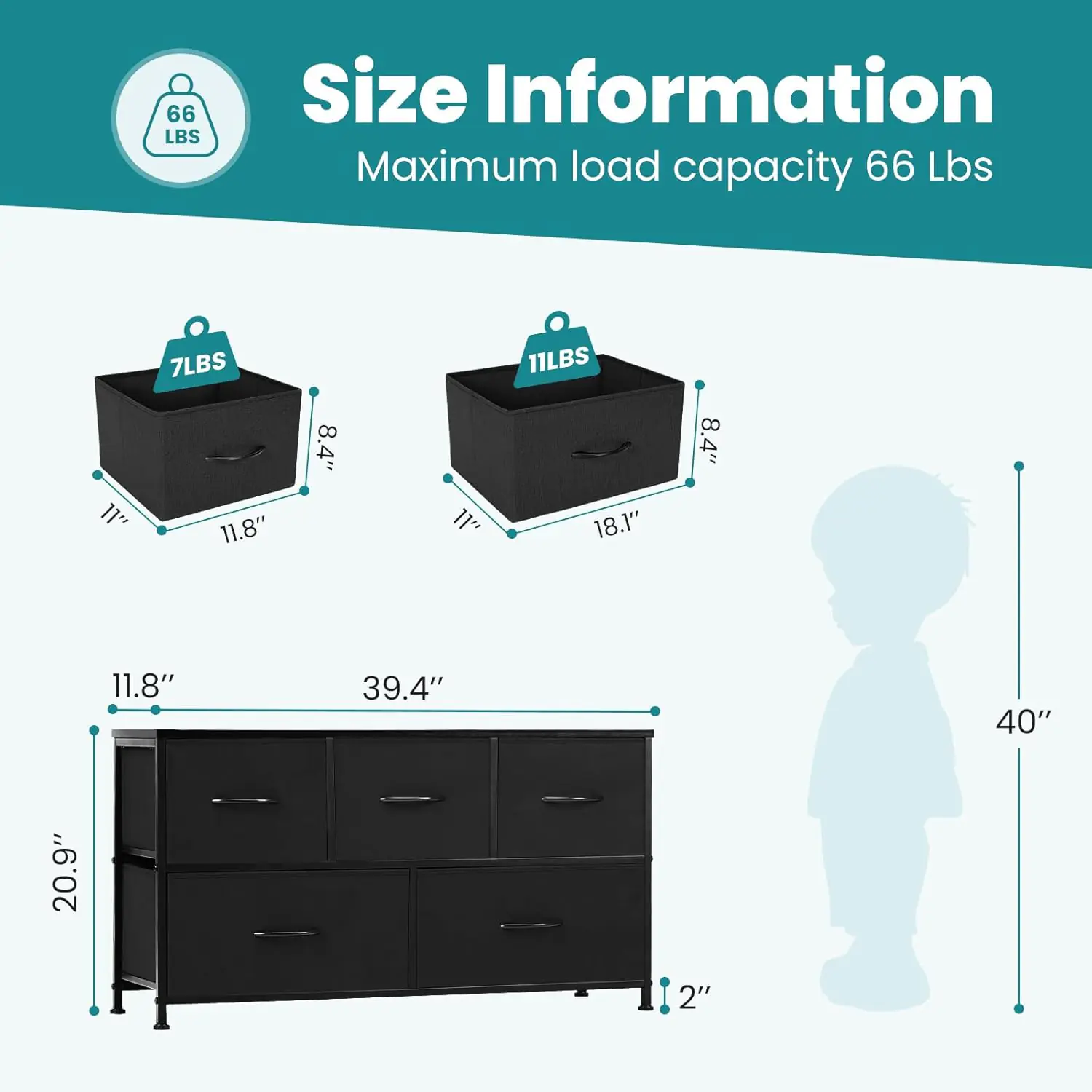 This 5 Drawer Fabric Dresser offers a versatile storage solution for organizing clothing, accessories, or daily essentials. Designed with a compact 38″ wide profile and durable fabric bins, it fits seamlessly into bedrooms, closets, or entryways, enhancing organization without taking up much space.