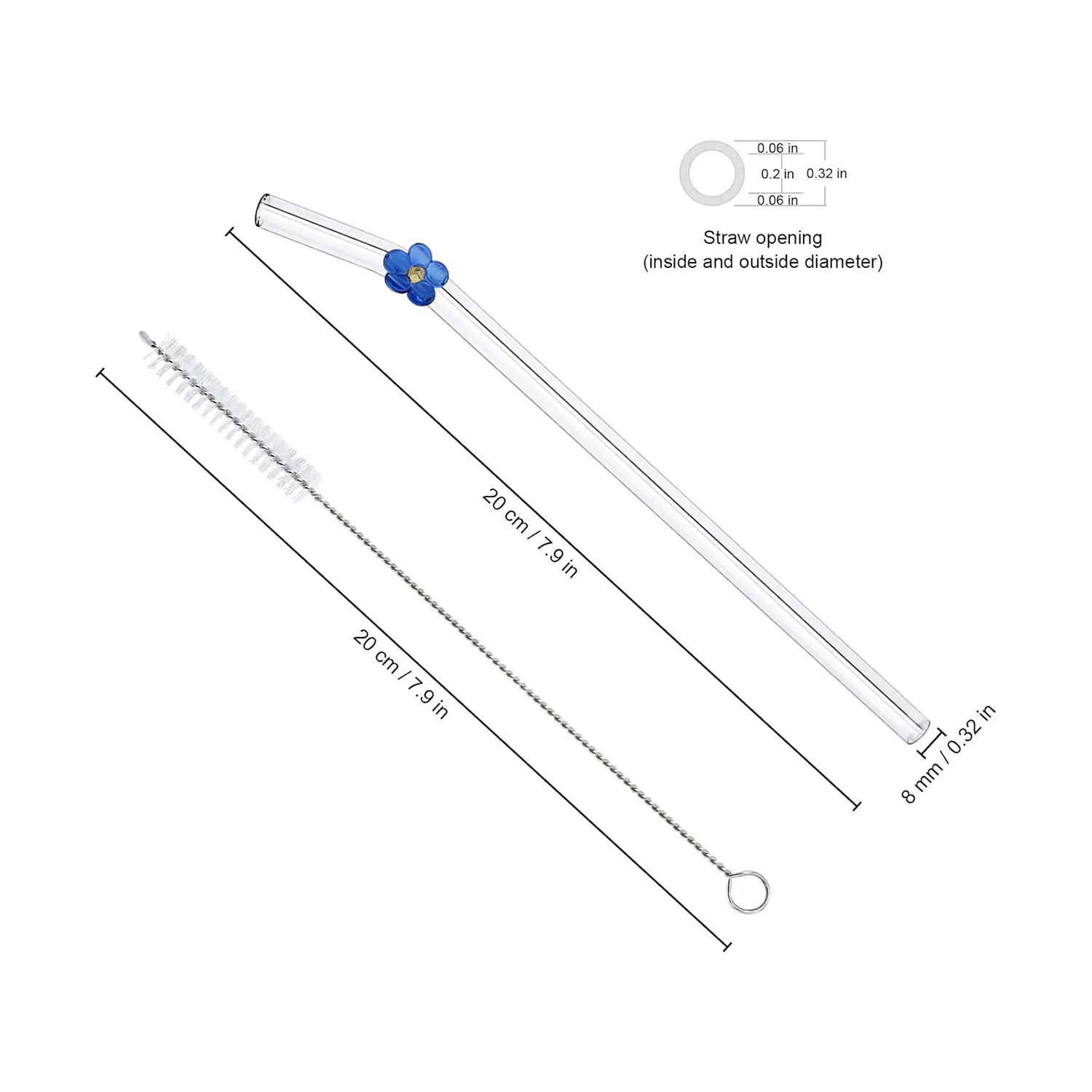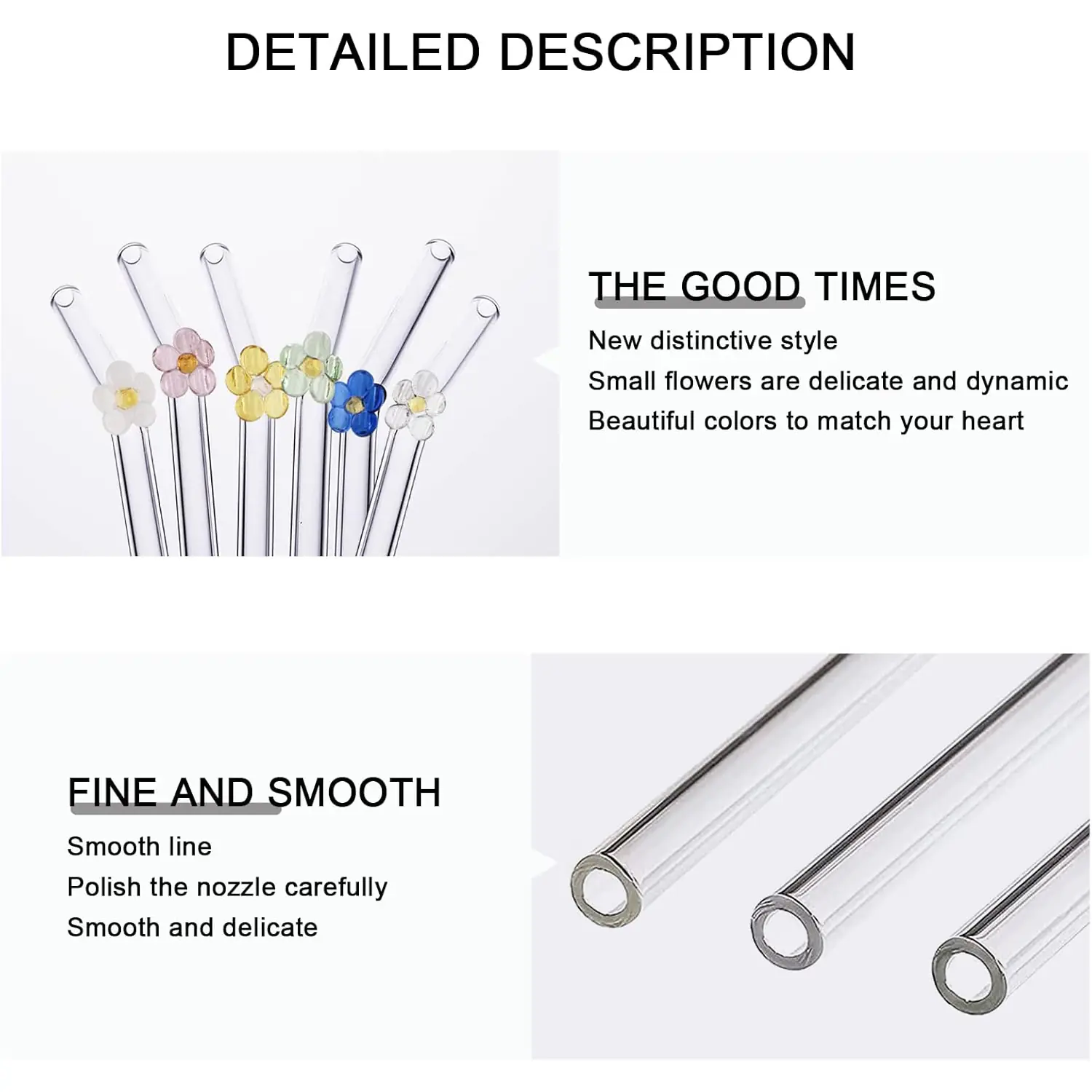 Each Glass Straw is made from durable, BPA-free borosilicate glass and is resistant to heat and cracking. The integrated flower charm is artisan-blown under high temperatures, ensuring long-lasting style and strength. These reusable straws feature a clear body for visibility and ease of cleaning, and are dishwasher safe or can be manually washed with the included brushes.
