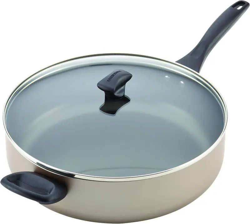 Oven safe to 350 degrees Fahrenheit, this nonstick jumbo cooker includes a shatter-resistant glass lid