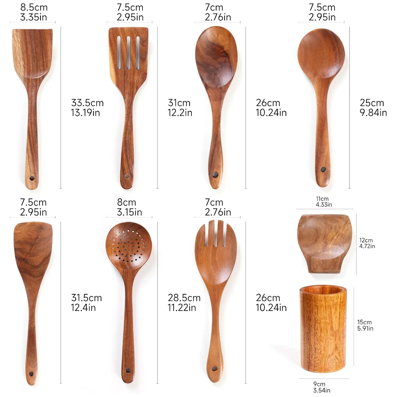 • Natural Teak Wood: Crafted from premium teak wood, these utensils offer durability and a beautiful rustic aesthetic.