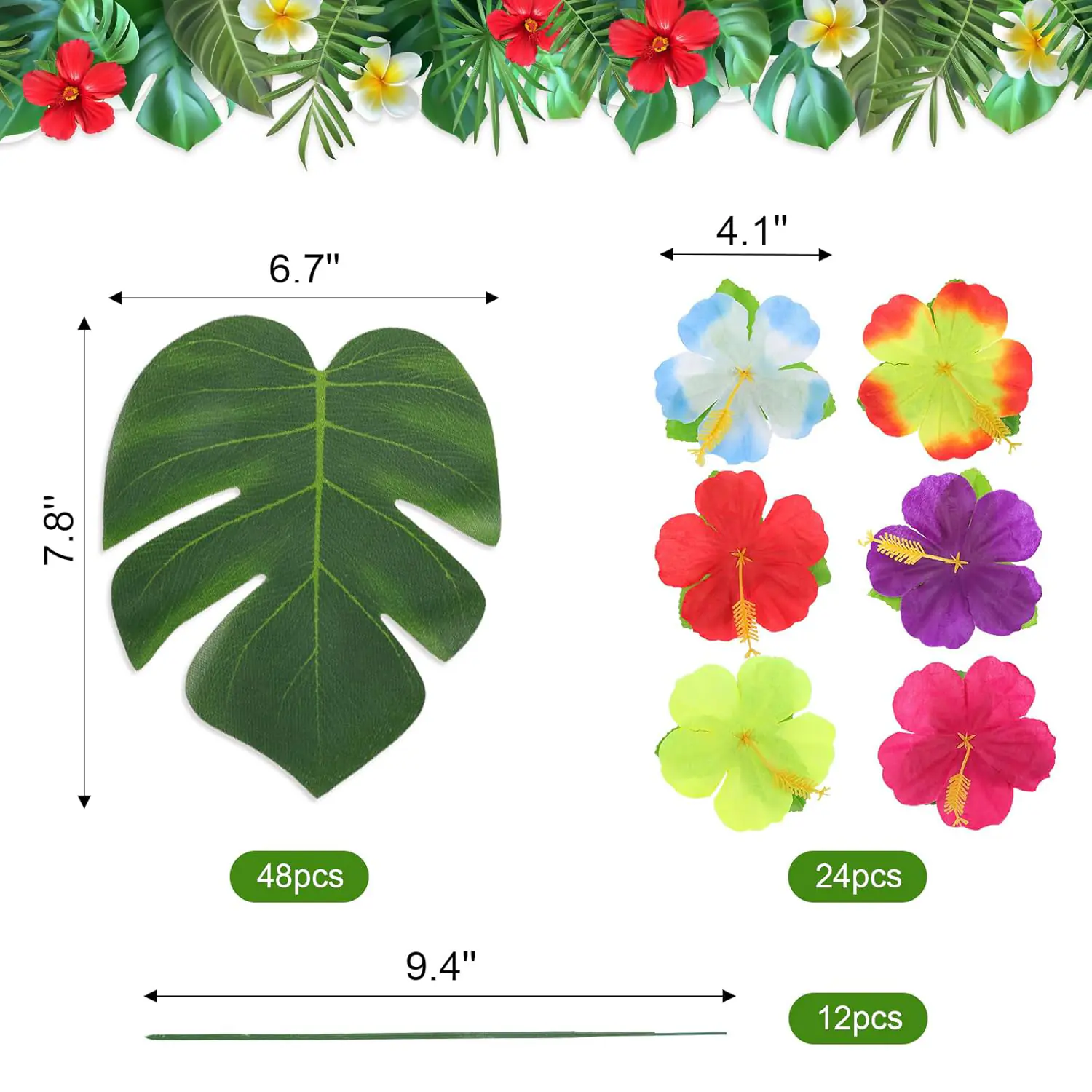 This 72-piece set includes Artificial Tropical Palm Leaves, hibiscus flowers, and bendable stems—perfect for creating lush, vibrant decor. Each palm leaf measures 8 inches, with 4-inch hibiscus flowers and 9.45-inch stems for easy assembly. Ideal for tropical-themed events, this versatile kit adds instant island flair to any party or display.