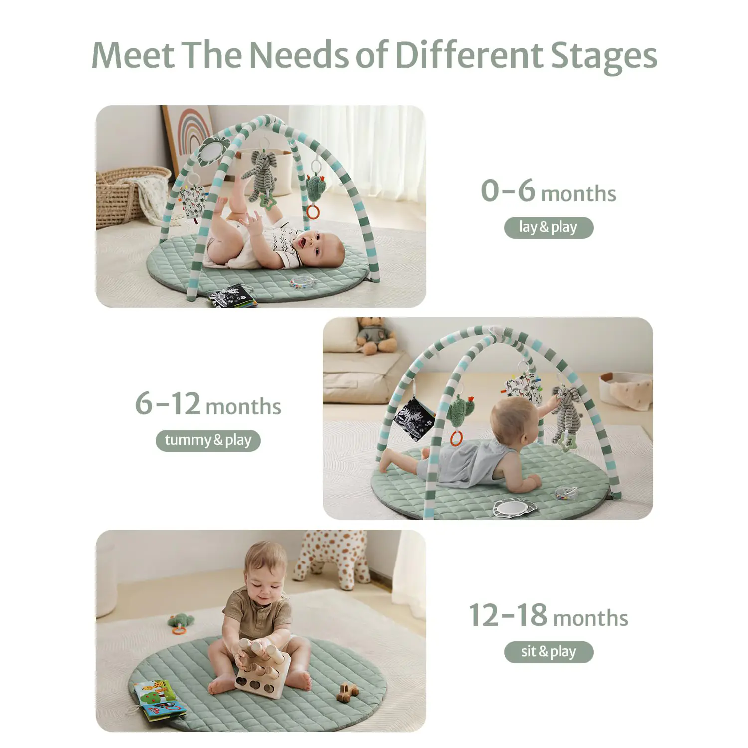Equipped with 6 detachable sensory toys—including a baby-safe mirror, teether, rattle, and cloth book—this Baby Play Gym Mat enhances early learning across five senses. The non-slip backing, machine washable surface, and foldable structure offer both convenience and long-term durability.