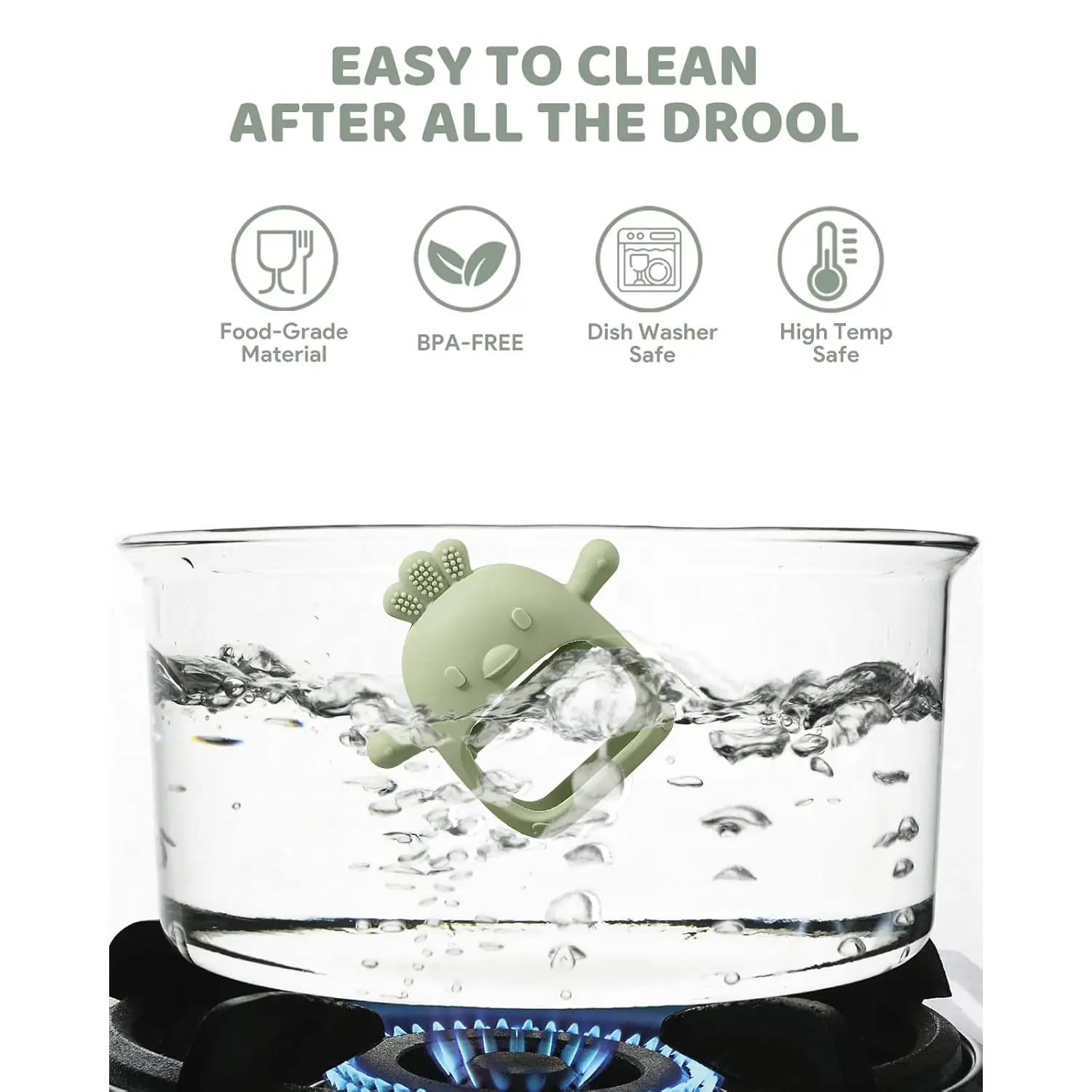 Made from food-grade, BPA-free silicone, each Baby Teething Toy features a soft, chew-friendly texture with raised bumps for gum massage. The inner grip bar helps babies grasp the mitten with ease, while the pacifier-like arms provide added soothing effects. Dishwasher and freezer safe, these chew toys exceed safety standards, ensuring worry-free use. Their dual-color design adds visual stimulation and gifting appeal for retailers.