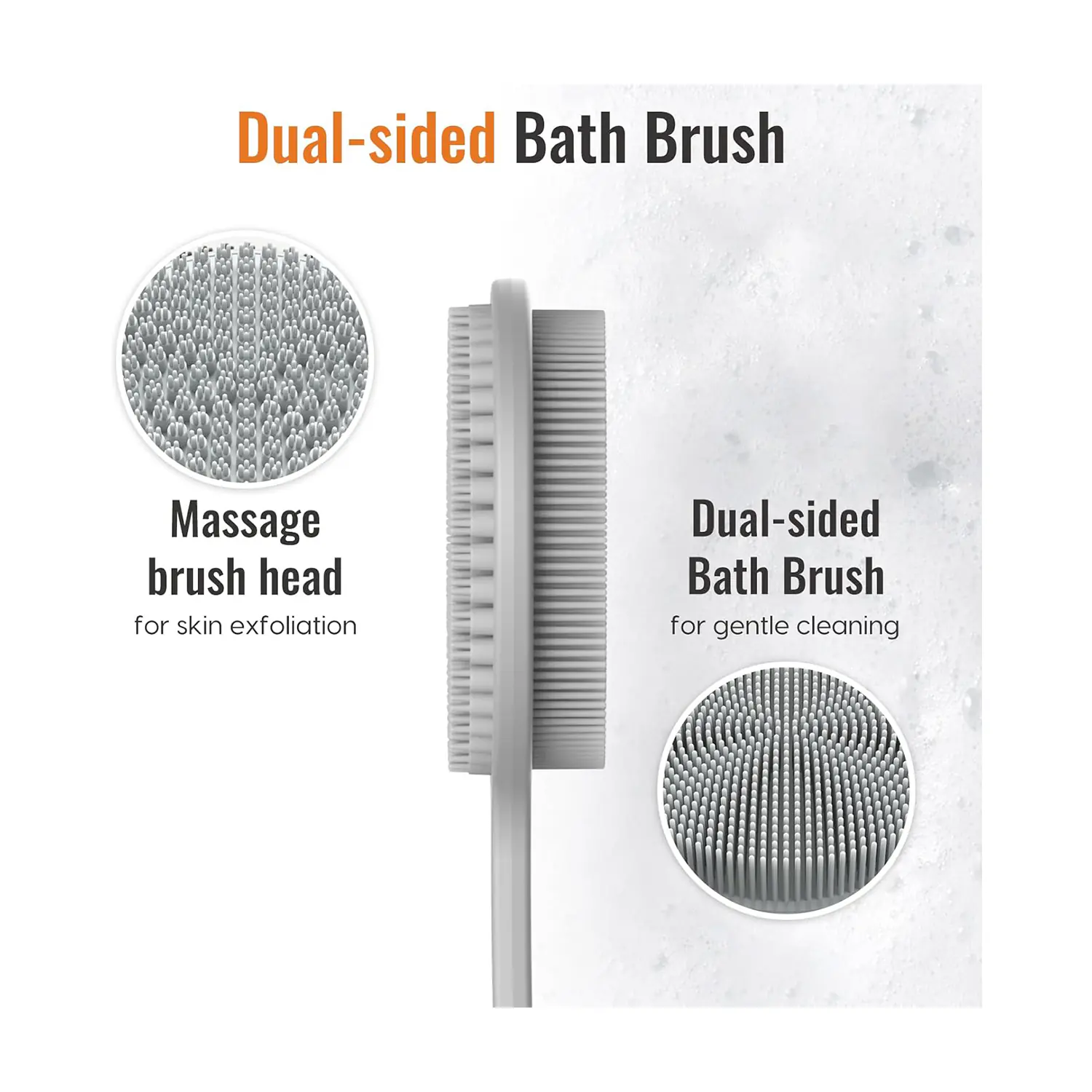 Engineered with soft, hygienic, food-grade silicone, this bulk silicone back scrubber boasts a double-sided head: one side with fine bristles for rich foam production and thorough cleansing, the other with massage nubs for stimulating circulation and exfoliation. The ergonomic long handle includes a non-slip grip and hanging hole, providing safety, convenience, and durability—far superior to traditional loofahs or wooden brushes.