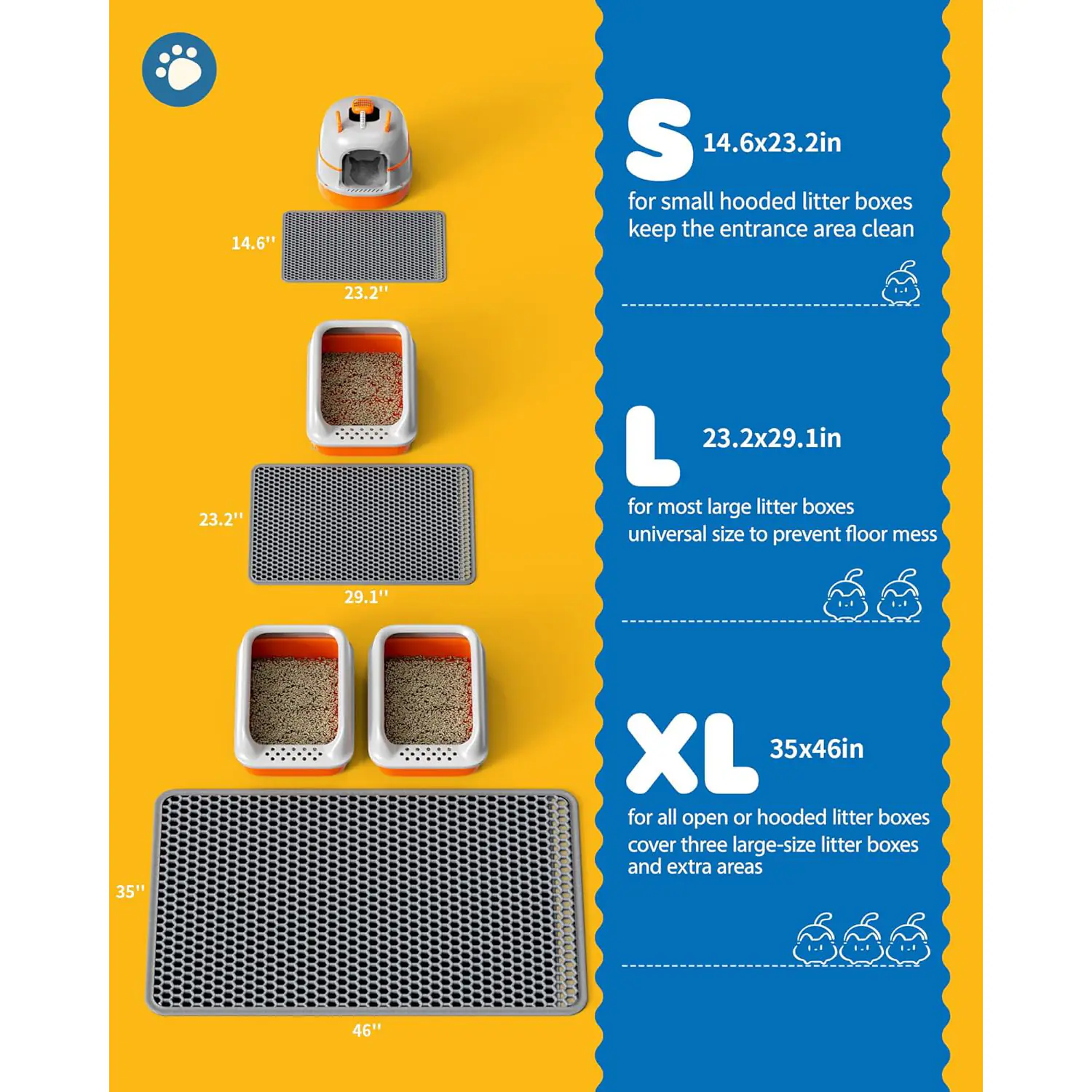 The double-layer honeycomb design effectively catches loose litter, while the waterproof, urine-proof EVA base protects floors from stains. Soft on paws yet scratch-resistant, this Cat Litter Mat is made from eco-friendly, non-toxic materials. The side-open feature allows for easy recycling of trapped litter back into the box.