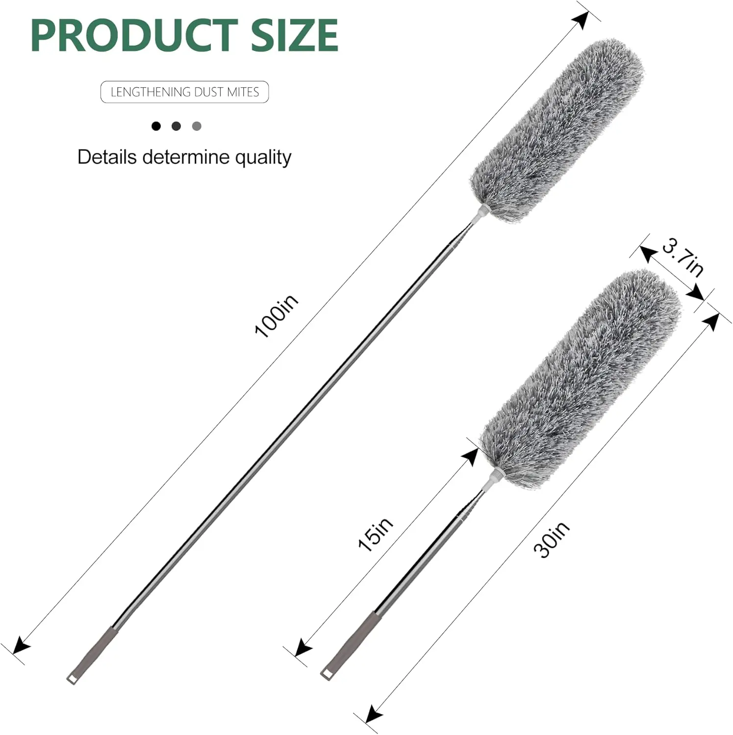 This extra-long ceiling fan duster features a stainless steel telescoping pole extending from 30 to 100 inches, enabling effortless cleaning of high ceilings, ceiling fans, blinds, furniture, and cars. The microfiber head effectively captures dust, hair, and allergens for versatile dry or wet cleaning.
