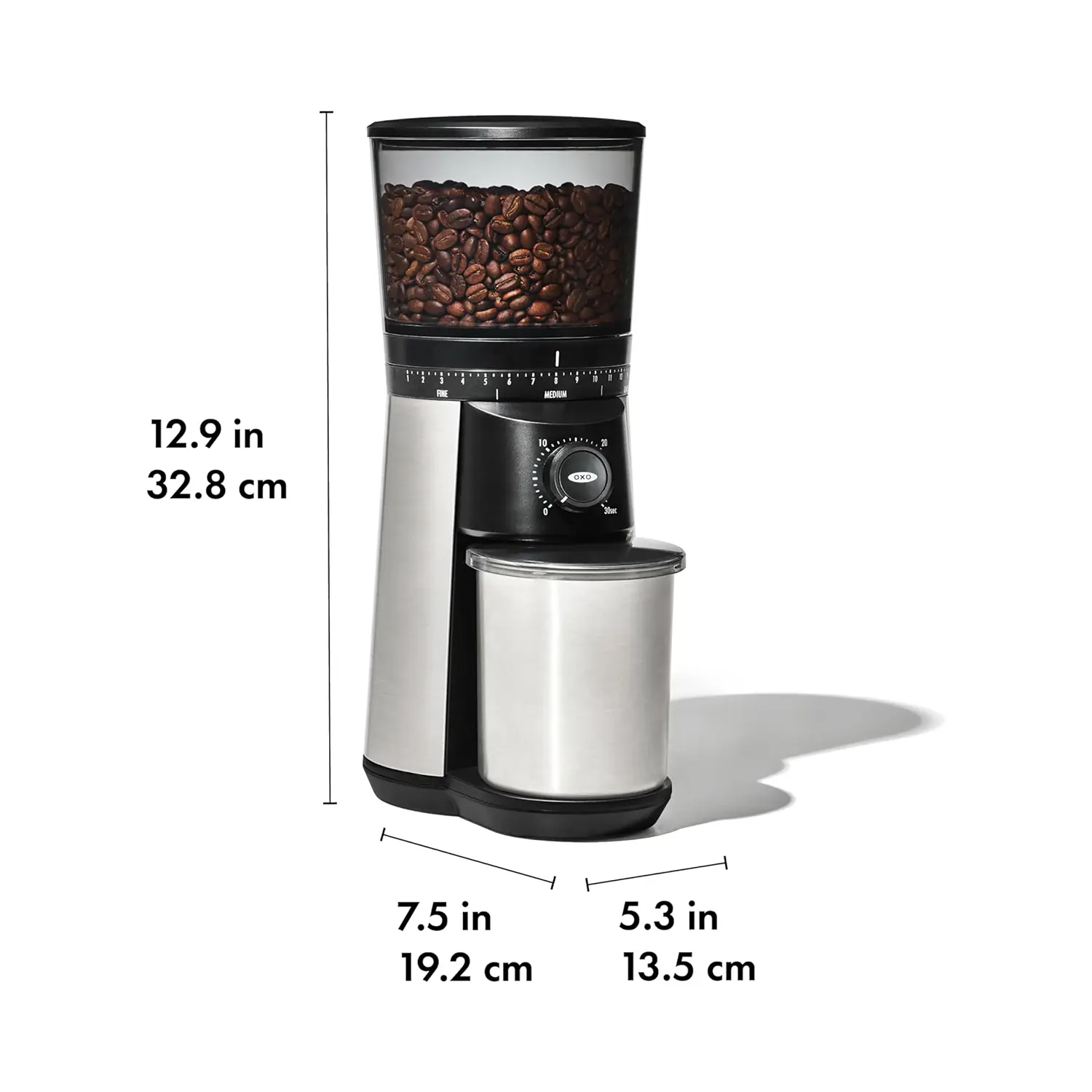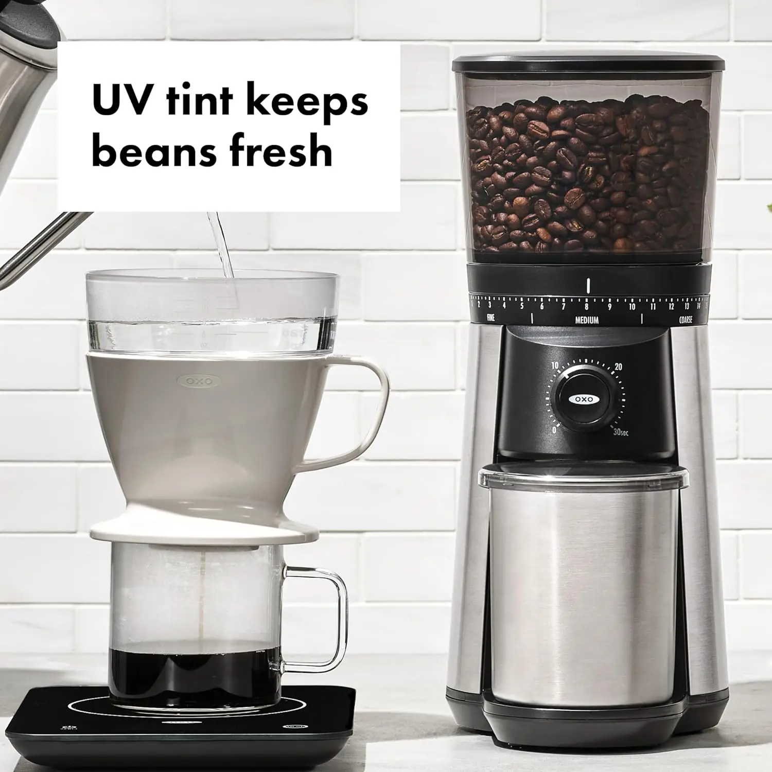 Equipped with stainless steel conical burrs, this grinder ensures even grinding while preserving the coffee’s natural flavor and aroma. Its one-touch start function remembers the last setting for fast operation. The static-reducing stainless steel container minimizes mess and clumping, while the UV-blocking tinted hopper protects beans from light degradation. A powerful DC motor prevents overheating, ensuring durability and consistent quality.