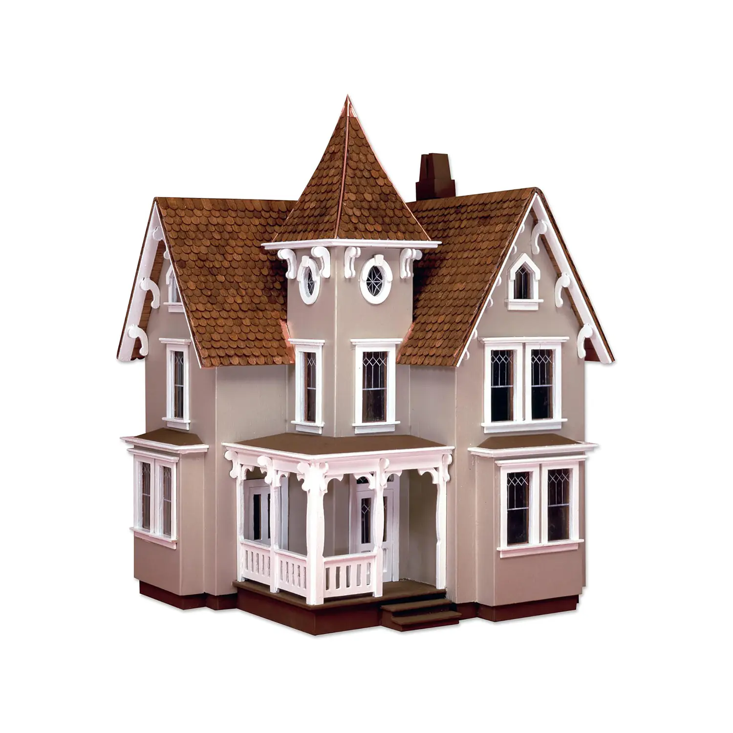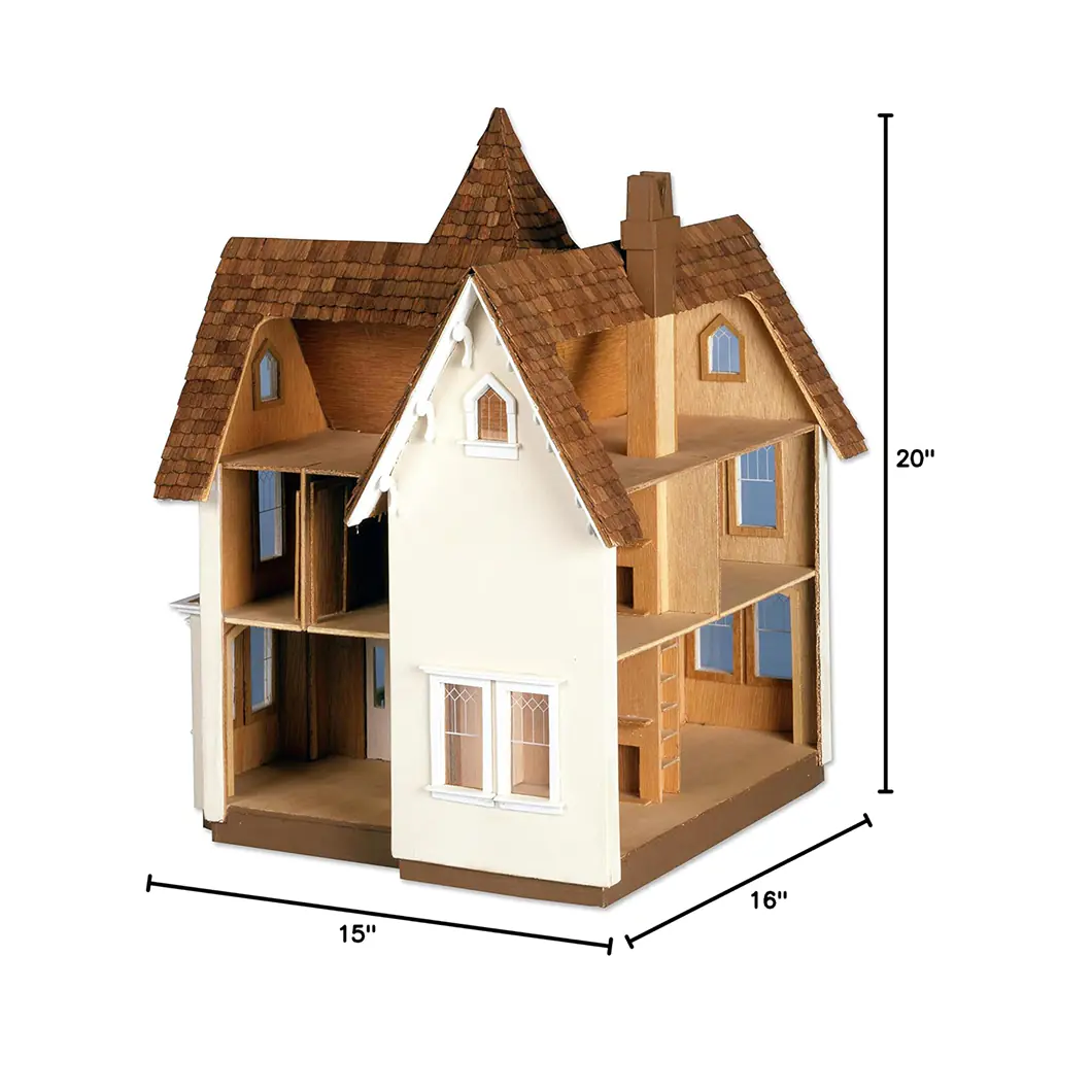 Crafted entirely from solid plywood, this Dollhouse Kit Set utilizes precise tab-and-slot construction for easy glue-based assembly. The kit includes detailed architectural elements such as a wrap-around porch, tower chamber, and two fireplaces. Half-inch scale shingles are included, and the structure is fully compatible with 1/24 scale miniature accessories—offering flexibility and long-term creative potential.