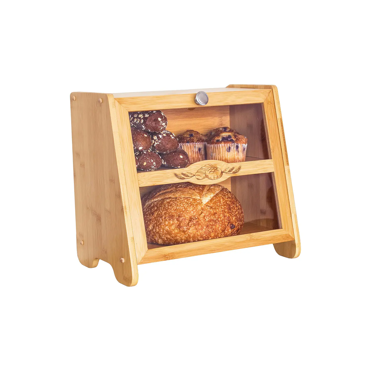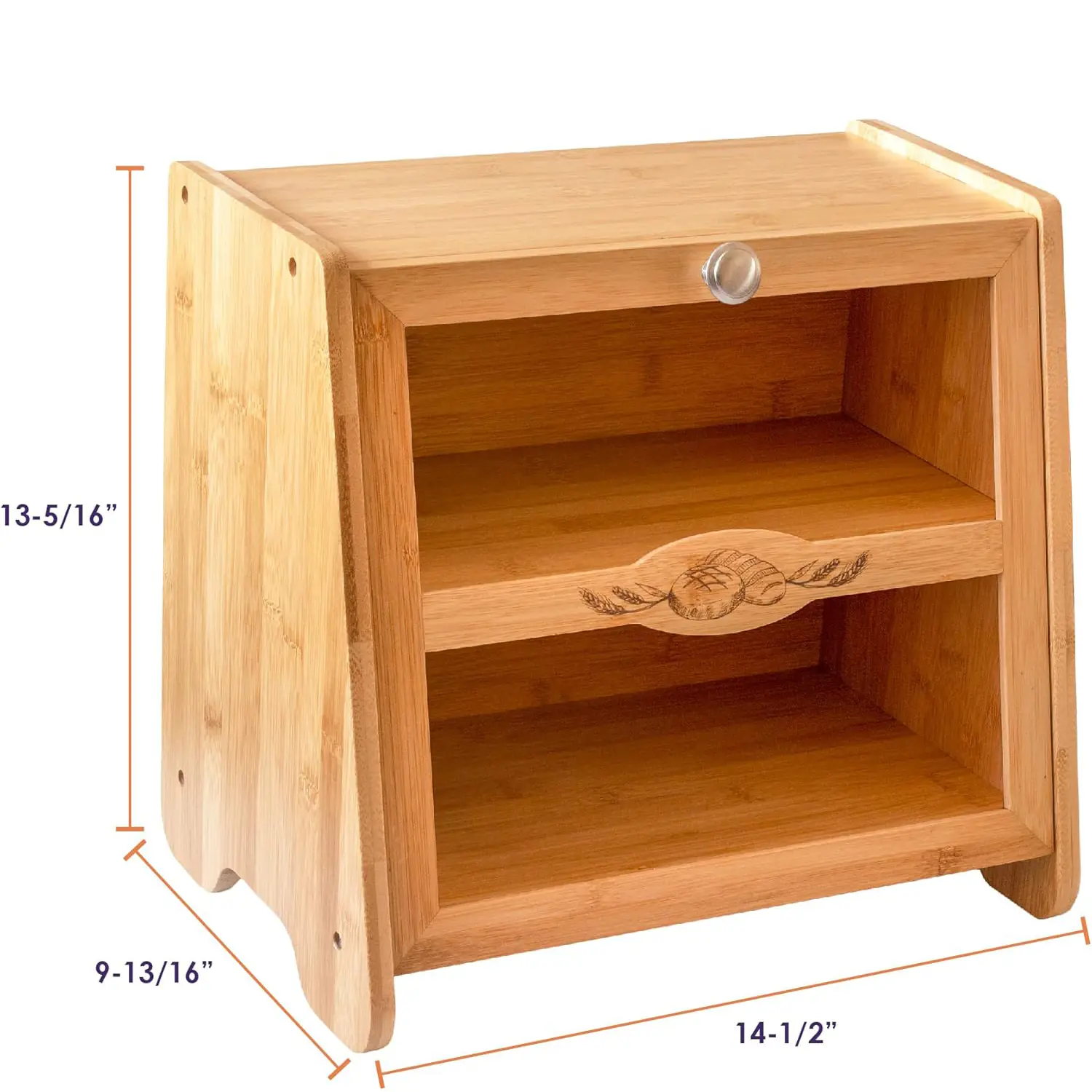 Conveniently store your bread while keeping it fresh with the Totally Bamboo Double Layer Farmhouse Bread Box. This extra-large bread box includes two layers of storage space for loaves of bread, muffins, bagels, rolls, buns— all of your favorite baked goods! The bread box is masterfully crafted from bamboo and features a rustic farmhouse design that looks at home in any kitchen. The large windows on each level of the bread box make it easy to see what’s inside at a glance. The door features a smartly designed magnetic lock that closes securely every time. The bread box also features a flat surface on the top for additional storage space for dry goods and spices in your kitchen. The Totally Bamboo Farmhouse Bread Box ships knocked down to keep its carbon footprint low and assembles in just a few minutes. Once assembled, the thick bamboo walls of the bread box create a sturdy and lasting storage solution. The assembled Bread Box measures 14-1/2″ x 9-13/16″ x 13-5/16″. And bamboo is a wonderful material to use, not only is it strong and sturdy but it’s a sustainable resource that quickly regrows once harvested. Care for the bread box is easy, simply wipe clean with a damp cloth.