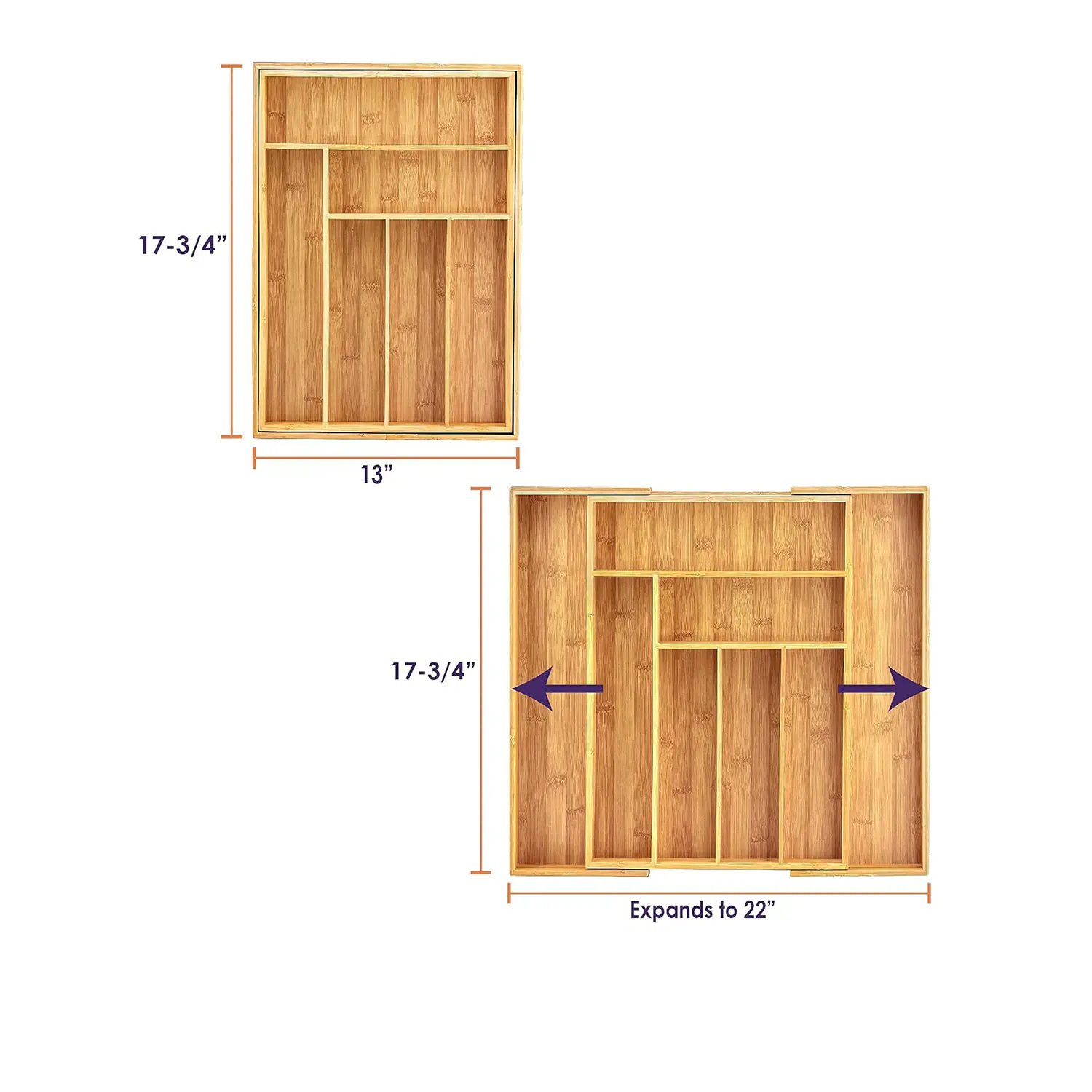 This adjustable organizer is ingeniously designed to fit any drawer. It features two independently sliding side compartments that expand the organizer from 13 inches up to 22 inches wide.