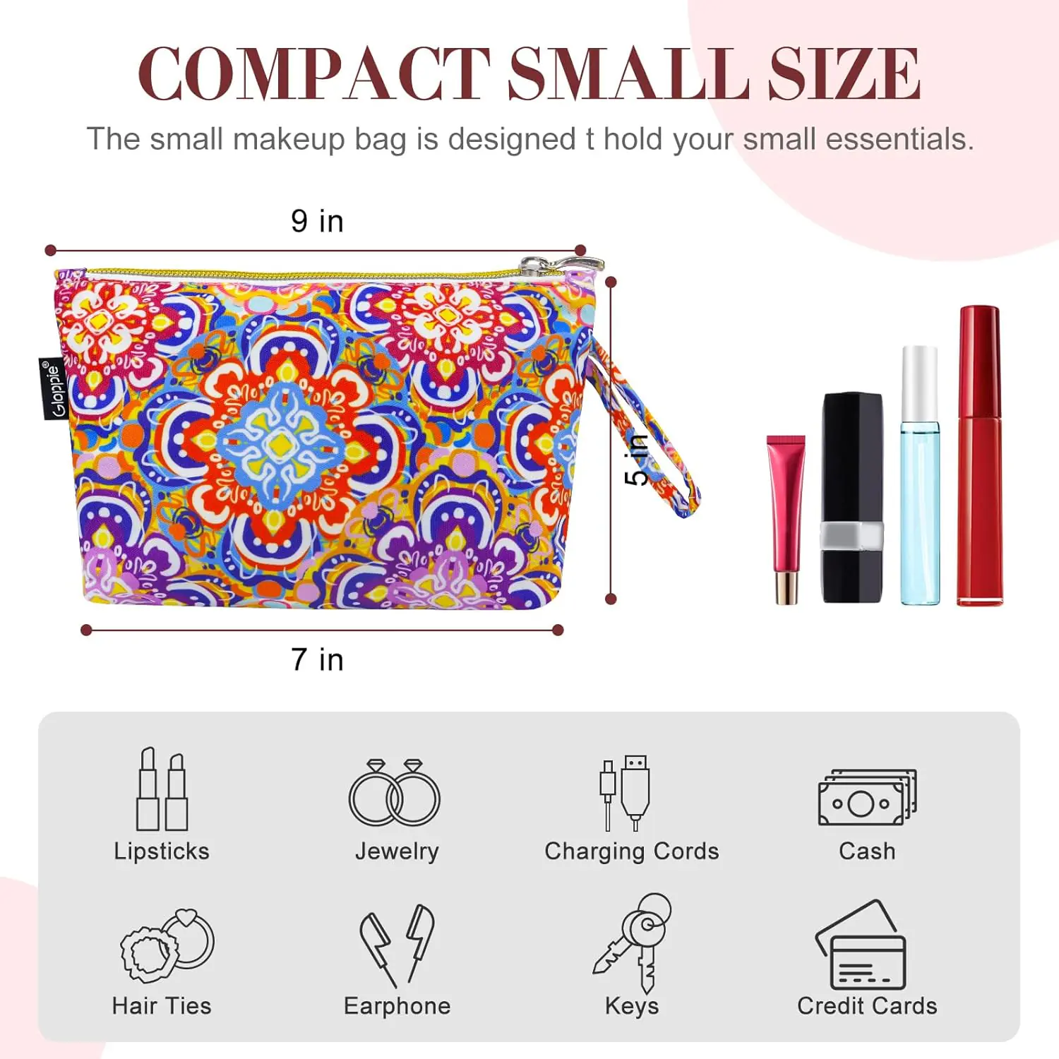 Size: 7.08*5.11 inches, portable and lightweight. The small cosmetic bag can hold some small cosmetics and skin care products, it can be used for change, lipstick, makeup tools, etc.