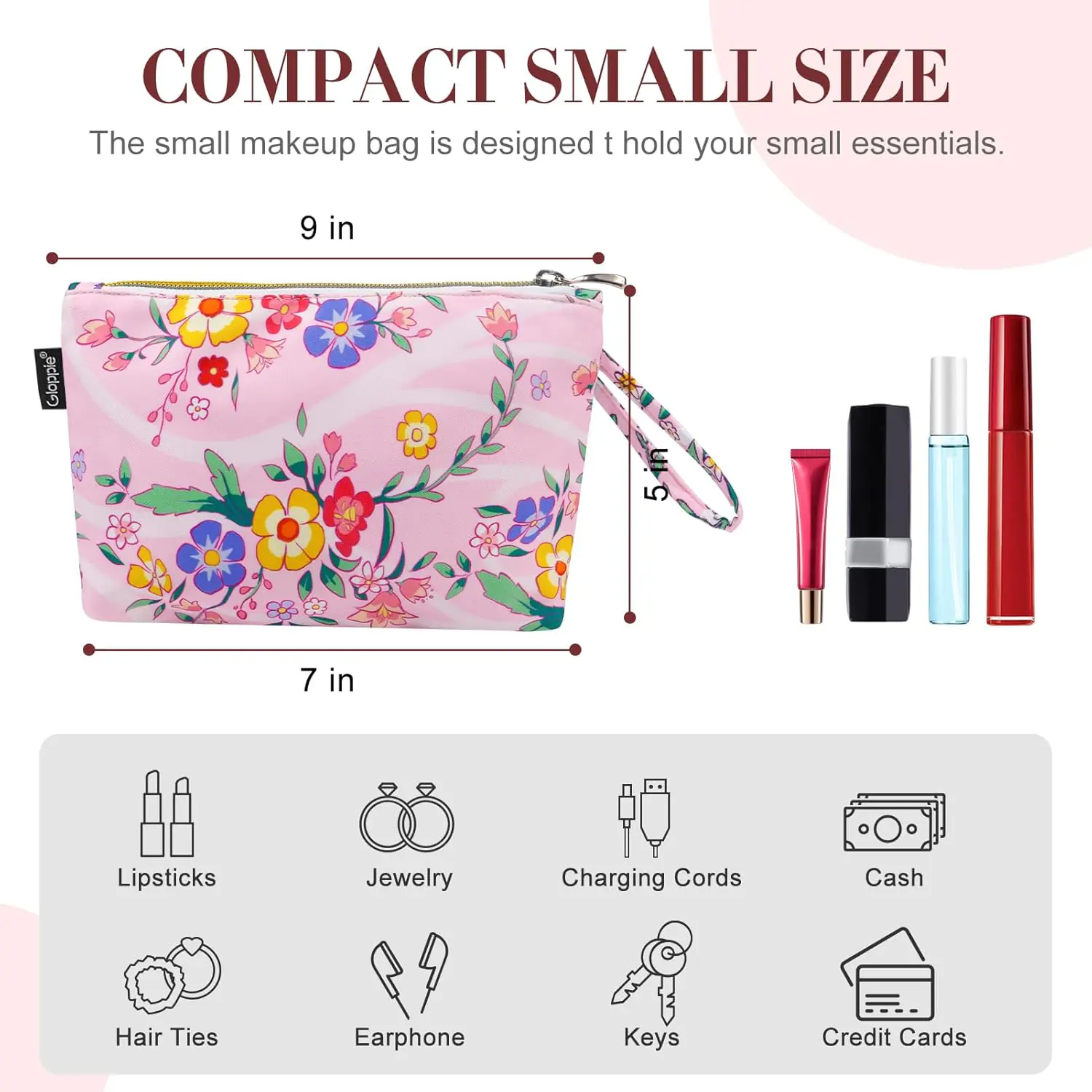 Size: 7.08*5.11 inches, portable and lightweight. The small cosmetic bag can hold some small cosmetics and skin care products, it can be used for change, lipstick, makeup tools, etc.