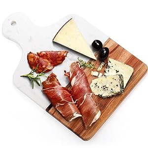 The marble and wood surface of the cutting board provides a sturdy base for cutting and preparing cheeses, fruits, and other appetizers.