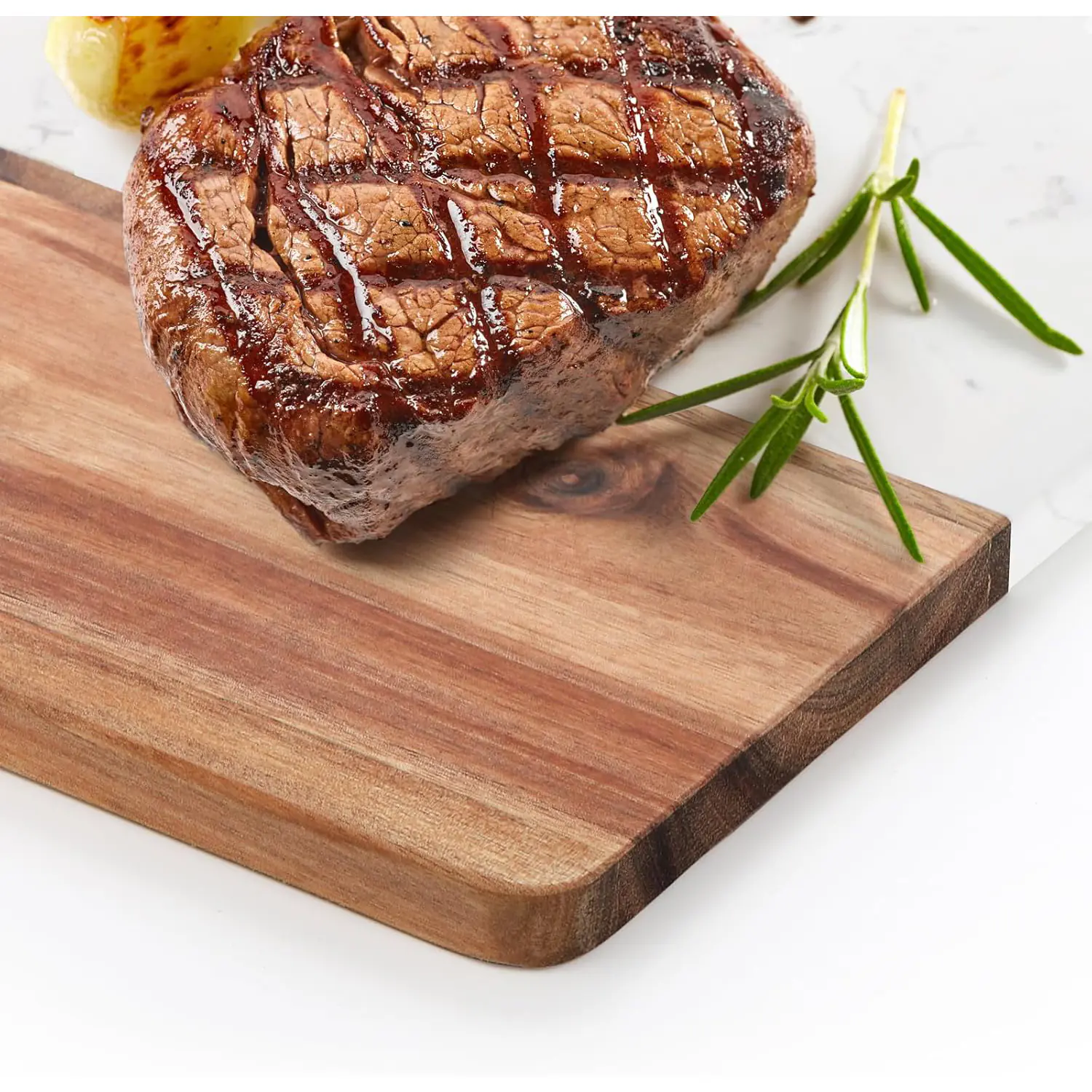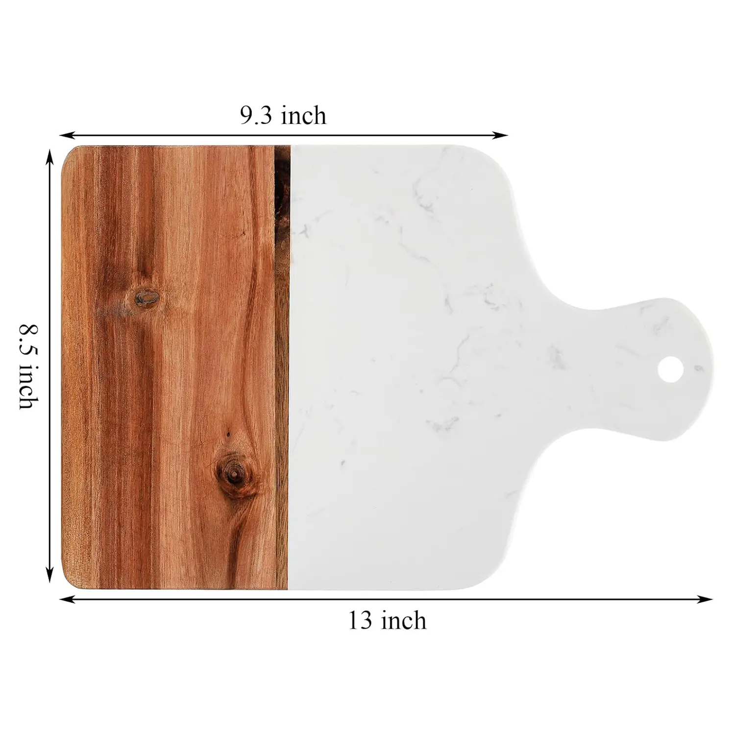Coloch white and acacia wood cutting board is 13” long and 8.5” wide as a whole. The board surface is 8.5 inches x 9.3 inches.