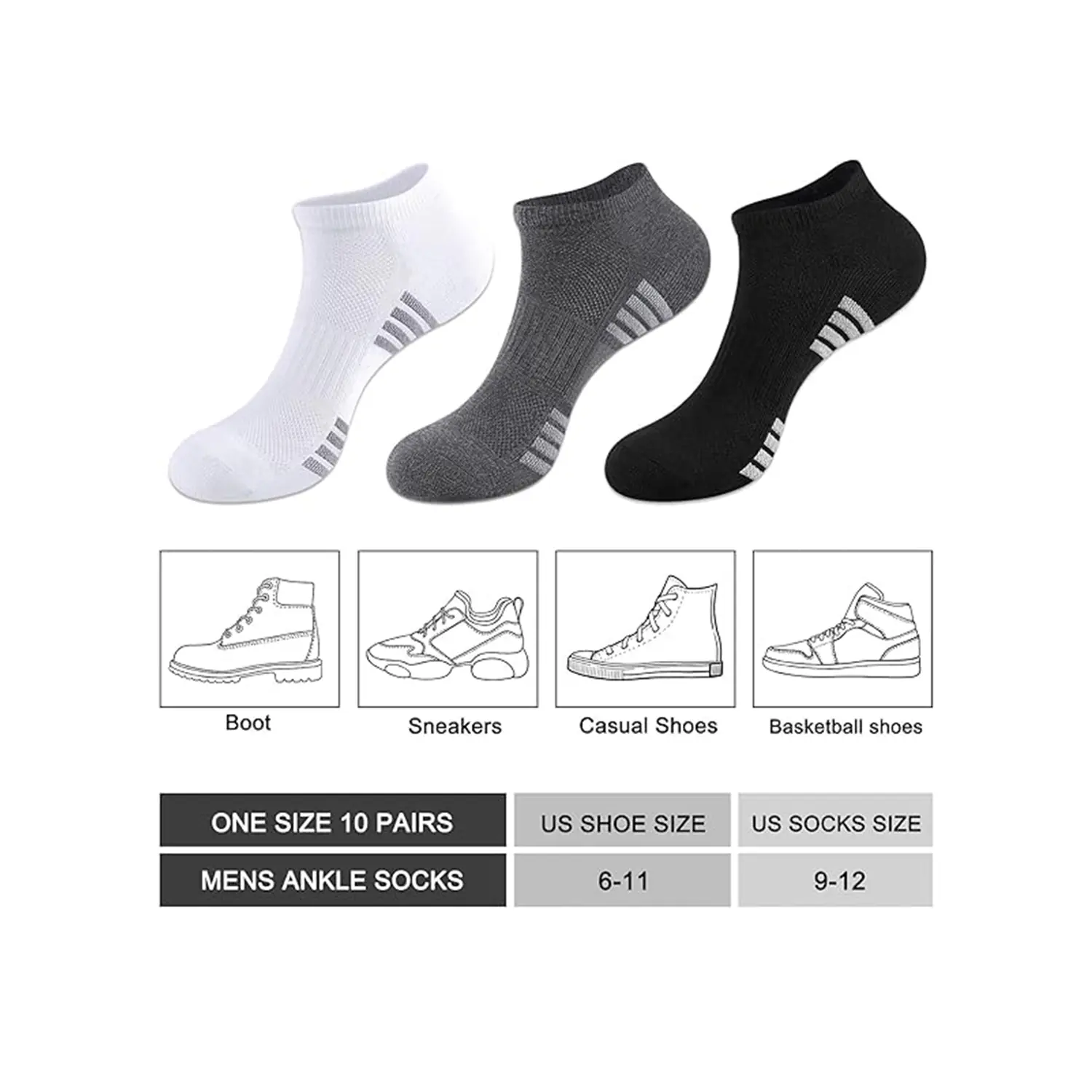 These Men’s Ankle Socks are designed for all-day comfort and support, ideal for bulk buyers seeking reliable everyday essentials. Each pack includes 10 pairs, sized to fit most US men’s sizes (shoe size 6–11). Crafted with arch support, breathable mesh, and cushioned soles, these low cut socks help maintain comfort and dryness throughout any activity.