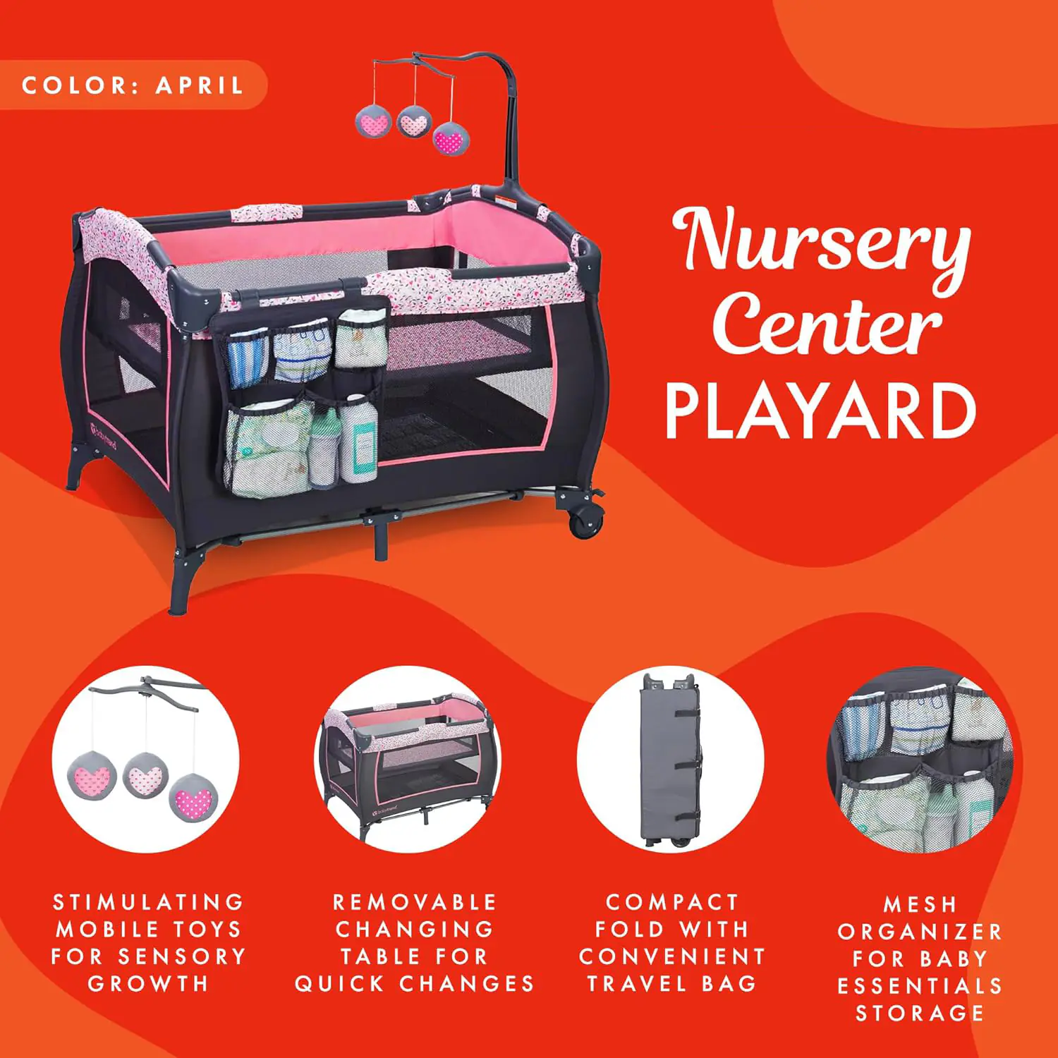 Equipped with a one-hand locking mechanism, breathable mesh sides, removable organizer, and large wheels with brakes, this Portable Crib Playard ensures convenience, comfort, and safety. Its dual-function design adapts as the child grows, from infant rest to active play.