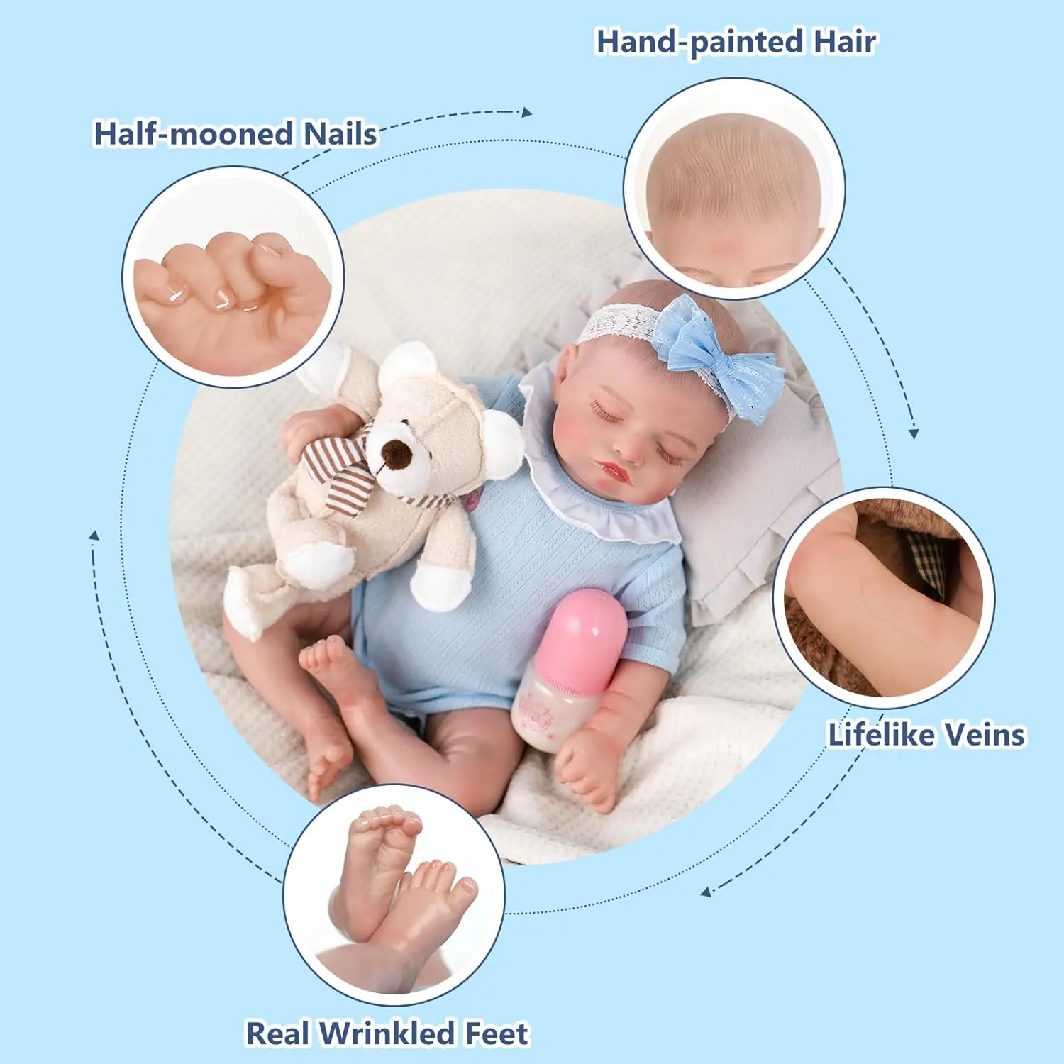 Featuring hand-painted lips, rooted eyelashes, and delicate skin tone with vein detail, this Reborn Baby Doll replicates a real sleeping baby. The soft, cuddly body enhances comfort while the included pacifier, bottle, and outfit set provide a complete role-play experience—ideal for storytelling and pretend parenting.