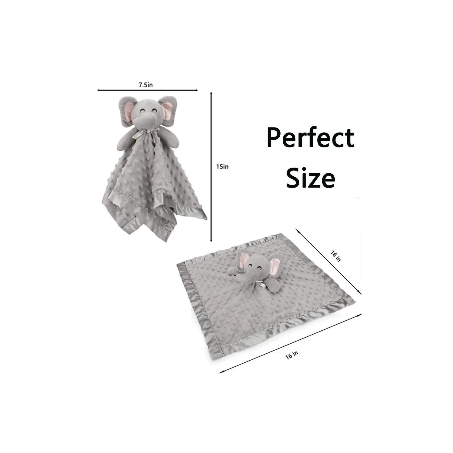 This Security Blanket is a soft, 16″x16″ elephant-themed comfort item designed to soothe newborns, infants, and toddlers. Made from OEKO-TEX certified fabrics, it features a plush elephant head and dual-texture blanket—minky dot and satin—for tactile engagement. Ideal for sleep time or on-the-go comfort, it helps calm babies quickly and supports emotional well-being.