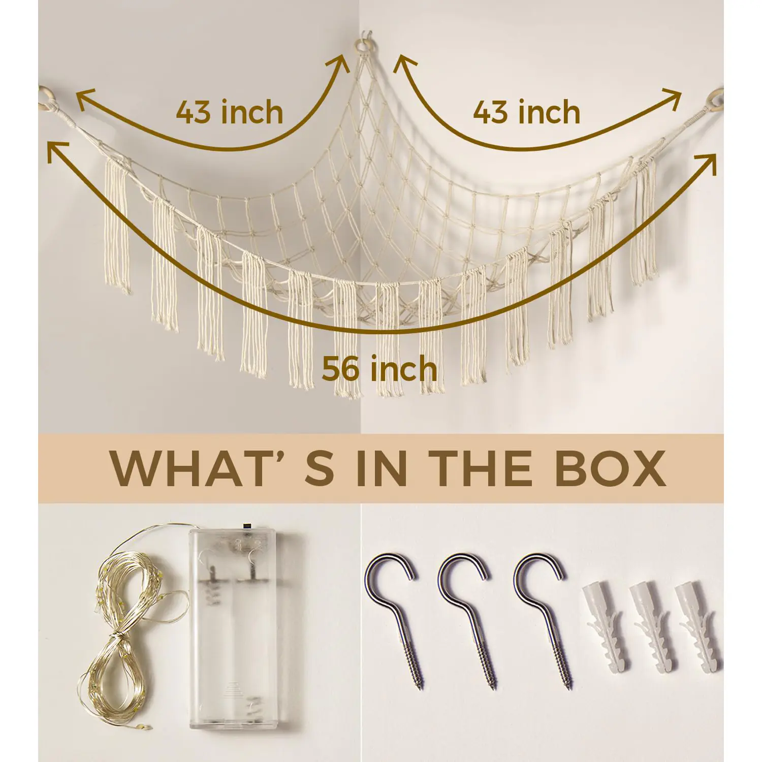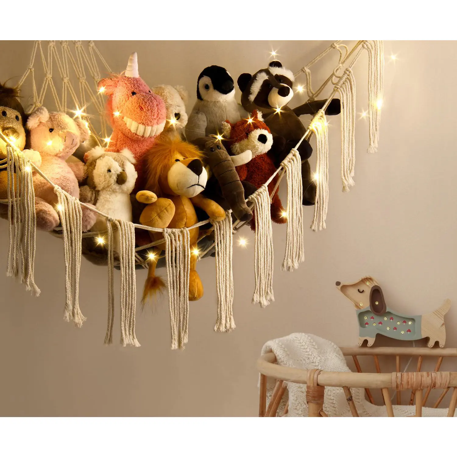 Equipped with an LED night light, this Stuffed Animal Hammock transforms storage into decor and comfort. Its handcrafted macrame design is eco-friendly, durable, and aesthetically pleasing. Includes hardware for easy wall mounting, making it practical and secure for daily use.