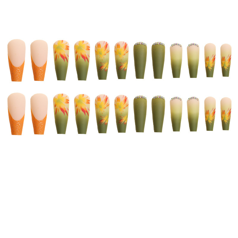 Our fake nails have very diverse styles, including color gradients, maple leaves and other elements. If you pack it, it is mainly used in color box packaging. You can clearly highlight the design of the fake film on the periphery of the packaging.