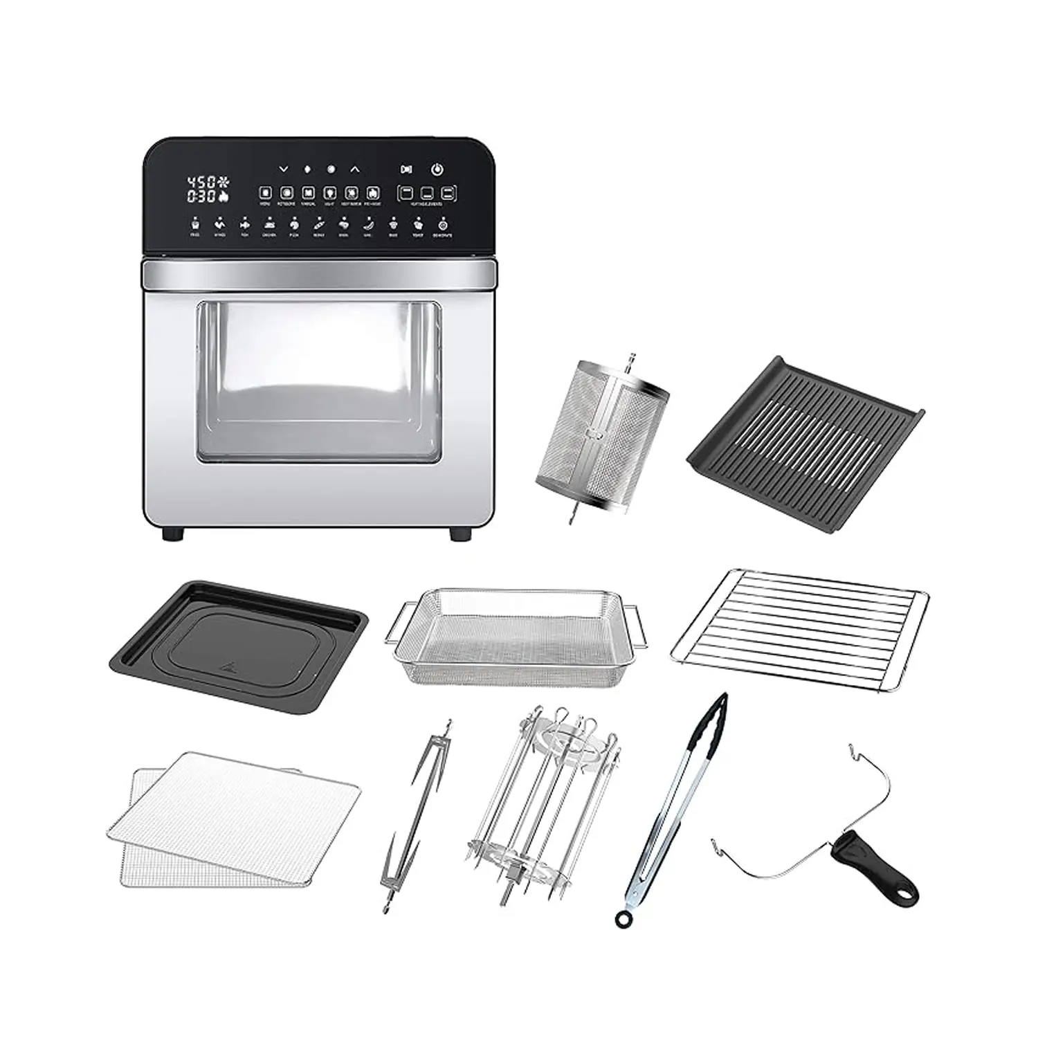 Equipped with dual heating elements and a heavy-duty cast aluminum nonstick grill plate, the Wholesale Air Fryer heats quickly and evenly, reducing cooking time significantly. Its stainless steel build withstands high temperatures up to 450°F, while the glass touch control panel and preset cooking functions enhance usability. Included are 11 accessories and 2 recipe books, making it a complete solution for commercial buyers looking for multifunctionality and convenience.