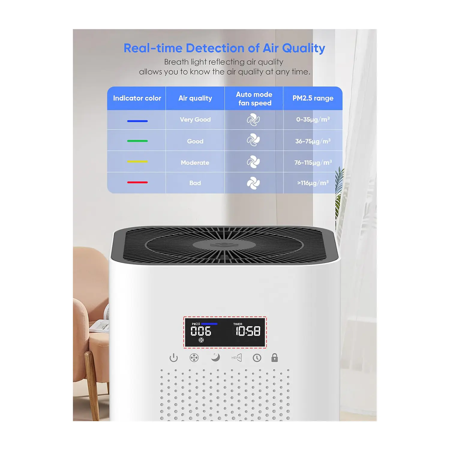 What sets this Wholesale Air Purifier apart is its advanced 4-stage filtration system combined with intelligent air quality monitoring. A built-in PM2.5 sensor displays real-time air conditions with color-coded indicators and adjusts fan speed automatically. Featuring ultra-quiet 22dB sleep mode, remote/touch controls, and multiple safety certifications, it provides reliable, energy-efficient purification with user-friendly operation.