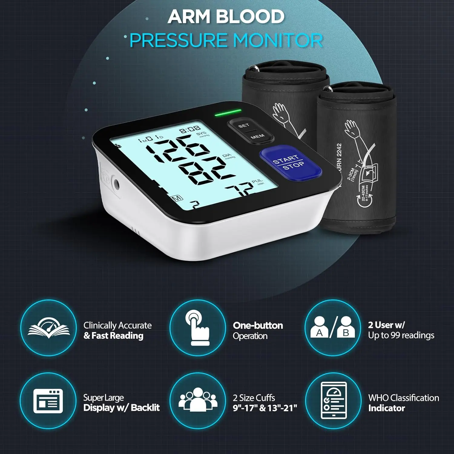 Equipped with advanced signal processing technology, this Wholesale Blood Pressure Monitor ensures consistent results. It offers dual-user memory, large backlit LCD, and ergonomic cuffs that improve comfort and precision. Its portability with dual power options makes it a high-demand product for wholesale distribution.