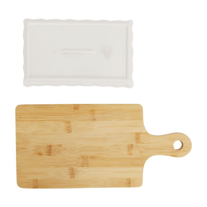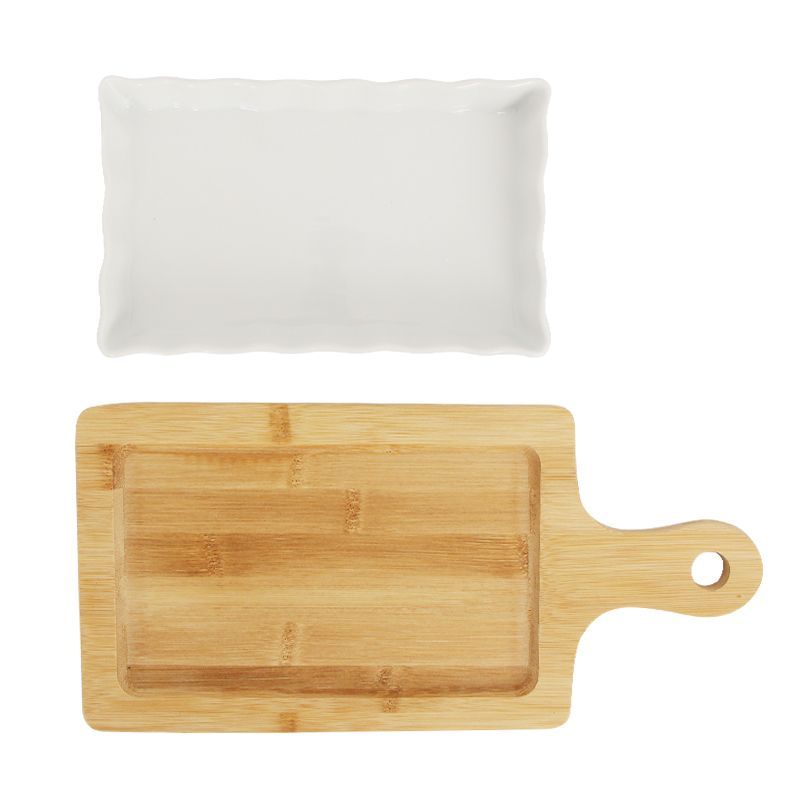 We are professional wholesale ceramic snack tray supplier from China. This item comes with one ceramic snack plate and one bamboo tray. It’s a good ideal for holding a variety of condiments, snacks, nuts, fruit, dips, sauces and much more. Bamboo tray can work as a serving tray and also a cutting board,multifunction.