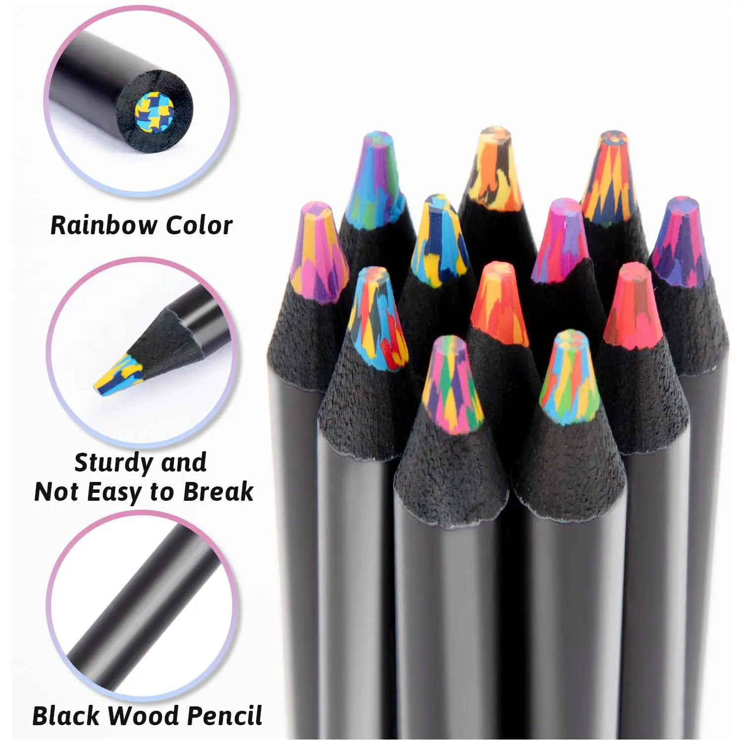 The Wholesale Colored Pencil set features 12 vibrant rainbow pencils designed for both children and adults who enjoy creative expression. Each pencil includes multiple blended pigments that create dynamic and colorful gradients, making it perfect for drawing, sketching, coloring books, and DIY art projects. Crafted from durable black wood with a thick, break-resistant core, these pencils ensure long-lasting use and smooth coloring performance. Ideal for wholesalers targeting art supply retailers, educational stores, or gift shops seeking eye-catching and high-quality stationery.
