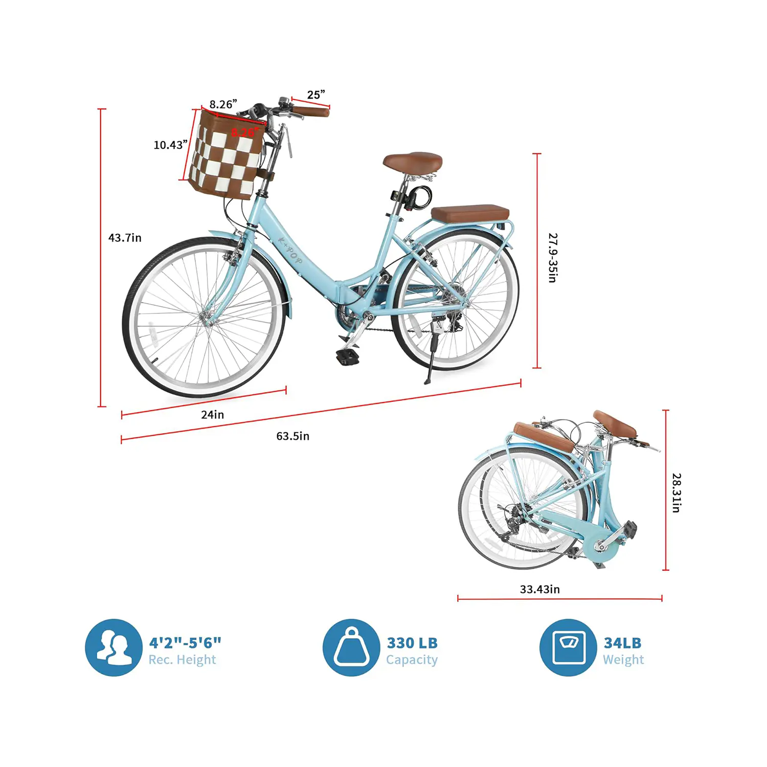 The wholesale folding cruiser bike combines practical folding capability with enhanced comfort features. A cushioned shock-absorbing saddle, dual V-brakes, and lightweight aluminum rims deliver stability and rider safety. Equipped with a front basket and rear rack, it provides ample cargo capacity. The 7-speed gear system supports adaptive riding on inclines or flat terrain, making it a flexible solution for daily use.