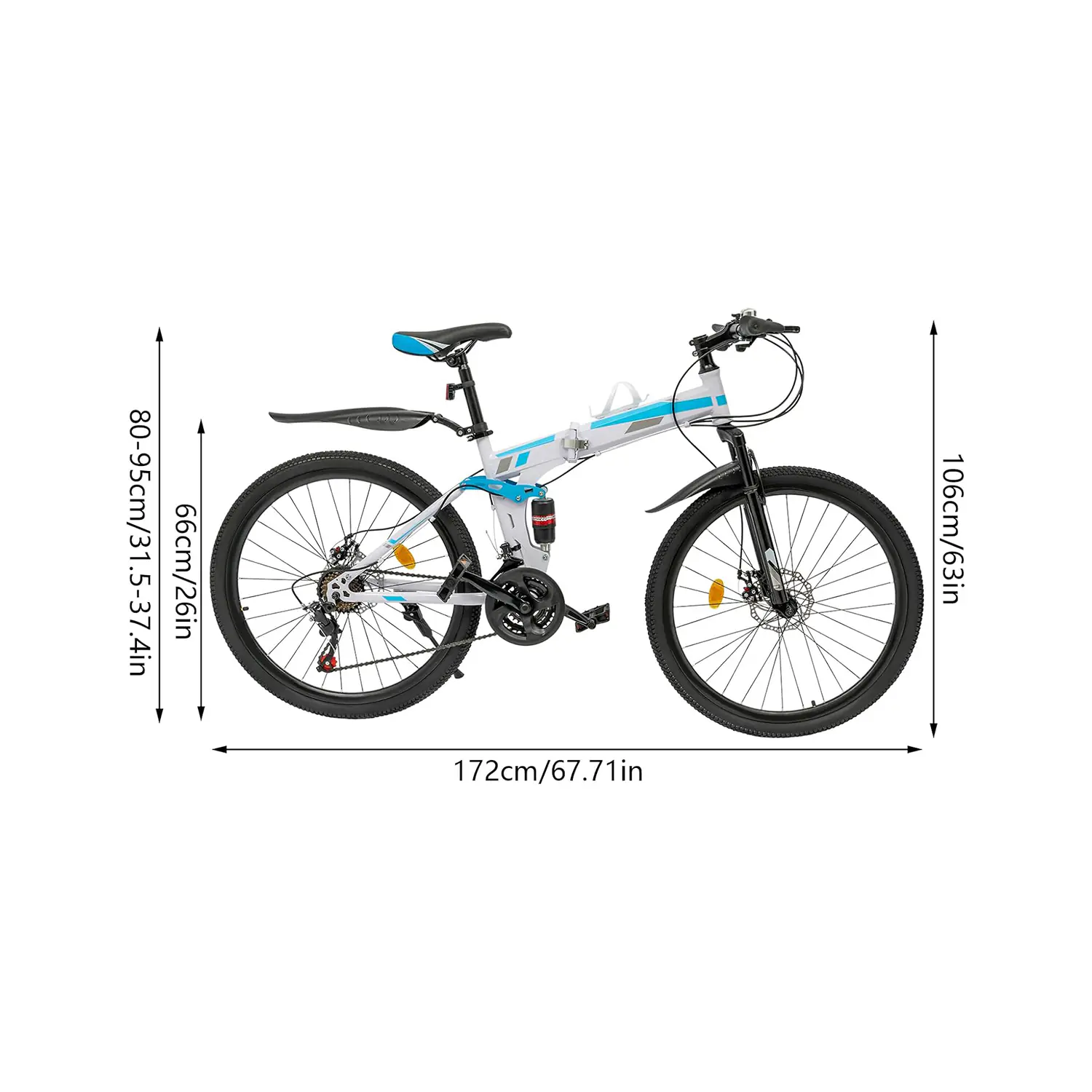 Engineered with a robust 21-speed drivetrain (3 front × 7 rear), this wholesale folding mountain bike delivers smooth gear transitions across inclines and flats. Its dual-disc braking system ensures dependable stopping power in all weather, while the shock-absorbing saddle and ergonomic handlebars enhance comfort. The foldable structure (37.4×39.37×13.78 inches) maximizes space efficiency, perfect for urban users or retailers focused on compact bike solutions.
