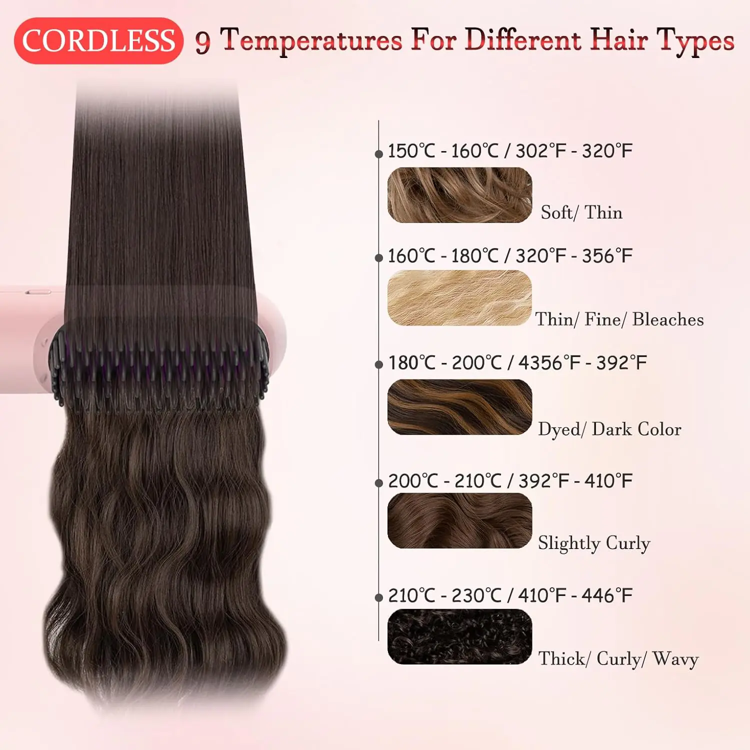 This Wholesale Hair Straightener brush is designed for professional buyers seeking a portable styling tool. Featuring cordless convenience and 9 adjustable temperature settings, it ensures smooth, shiny results while protecting hair from damage. With a lightweight build and powerful 9600mAh battery, it offers efficiency and mobility, making it an ideal product for wholesale distributors targeting beauty salons, travel retailers, and online stores.
