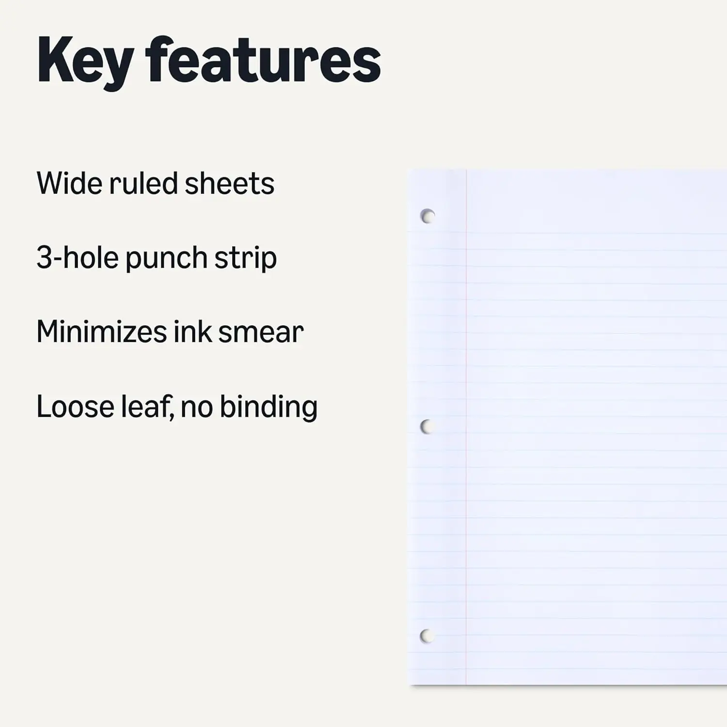 The Wholesale Loose Leaf Paper is designed for efficient writing, organizing, and sharing in schools, offices, and business settings. Each pack includes 150 wide-ruled sheets sized 10.5″ x 8″, offering ample space for notes, reports, or instructions. The reinforced three-hole punched edge allows for easy insertion into standard ring binders or pocket folders, ensuring compatibility with common filing systems. Ideal for educational suppliers, stationery distributors, and corporate buyers, this loose leaf paper provides smooth, clean pages that support a variety of writing tools while maintaining a professional appearance.