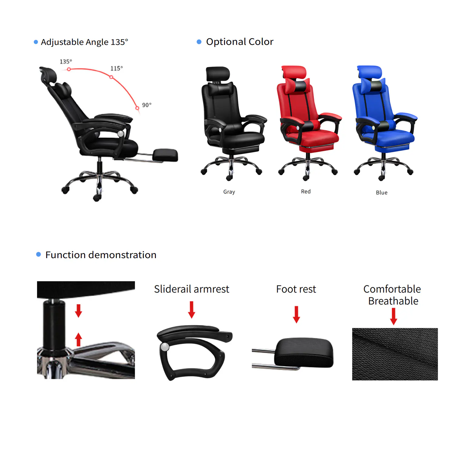 The Wholesale Office Chair With Footrest is designed to combine ergonomic support with modern functionality, meeting the needs of professional workplaces and home offices. With a high backrest, soft lumbar pillow, and thick sponge cushion, it delivers comfort for long hours of sitting. The 90–135° reclining function with a retractable footrest offers both productivity and relaxation, making it an excellent choice for distributors targeting business buyers.