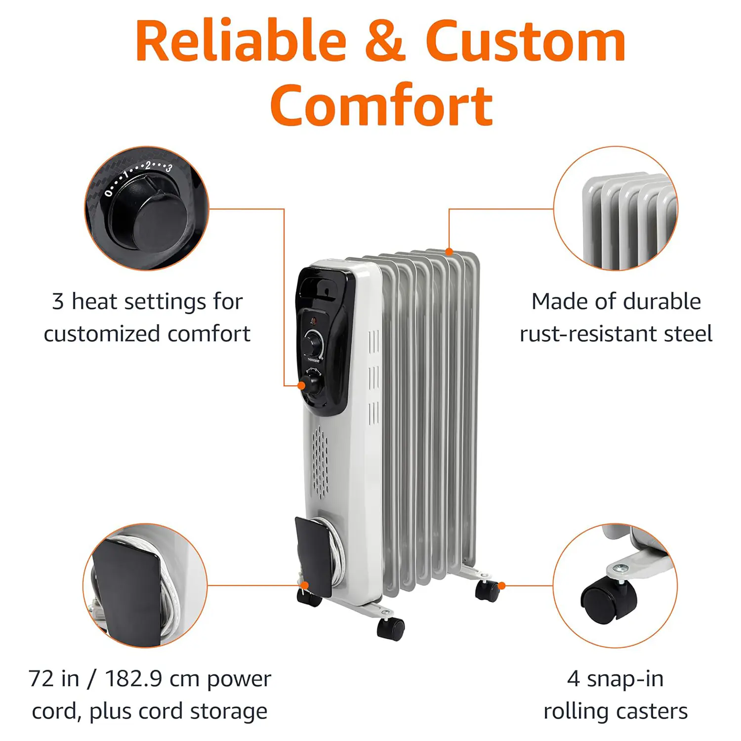This Wholesale Oil Heater features 7 oil-filled steel fins for consistent, long-lasting warmth, even after being turned off. Quiet, fan-free operation ensures no background noise, while ETL-certified safety features—tip-over and overheat protection—provide peace of mind. Its durable construction and portable design make it a dependable, energy-efficient choice for wholesale buyers serving both residential and commercial markets.