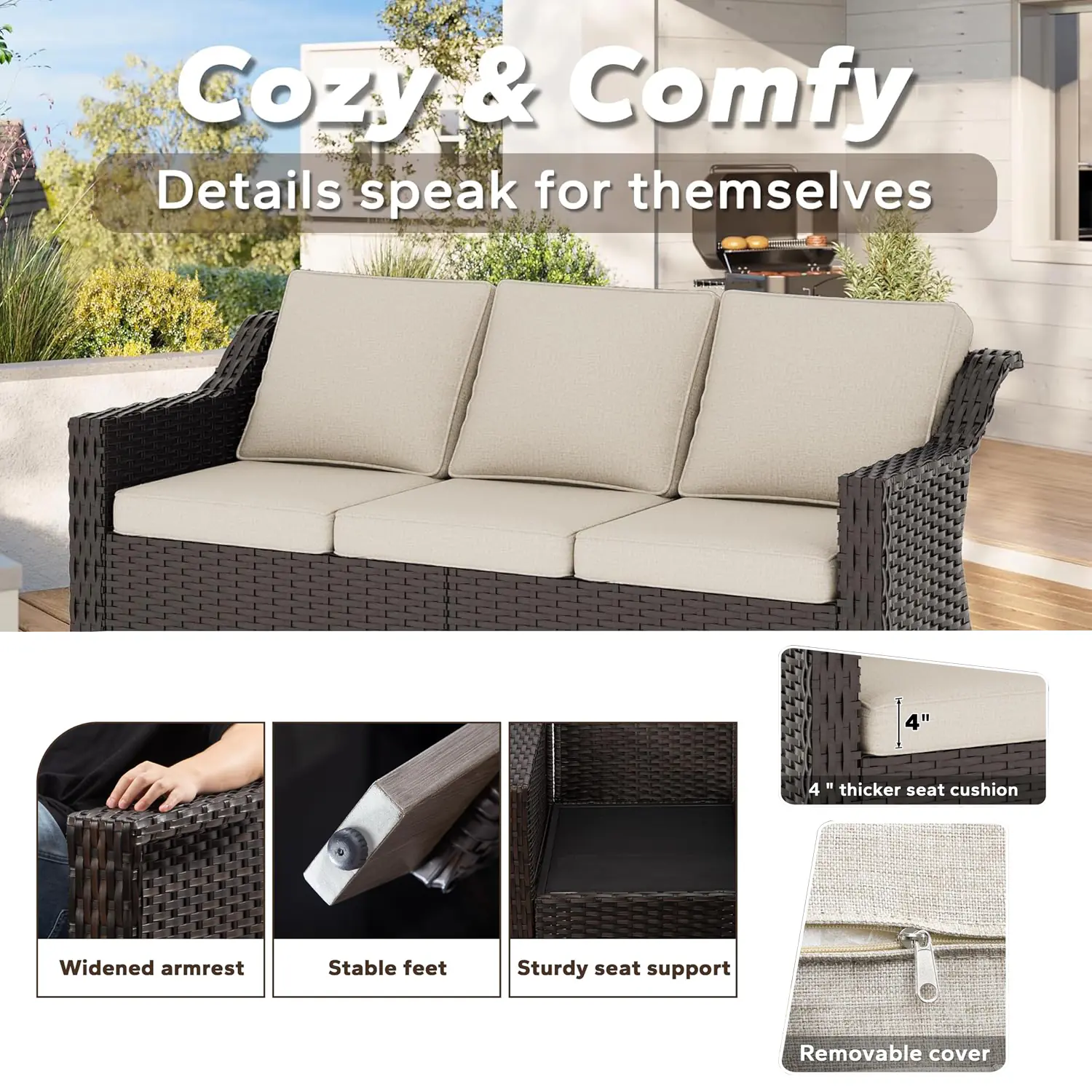 This Wholesale Rattan Patio Sofa features a high backrest, widened armrests, and deep seating for maximum comfort. Premium olefin cushions with polyester filling deliver plush support, while the all-weather wicker retains its color against sun exposure. Non-slip feet pads further enhance stability, offering a reliable seating solution for wholesale buyers focused on quality and style.