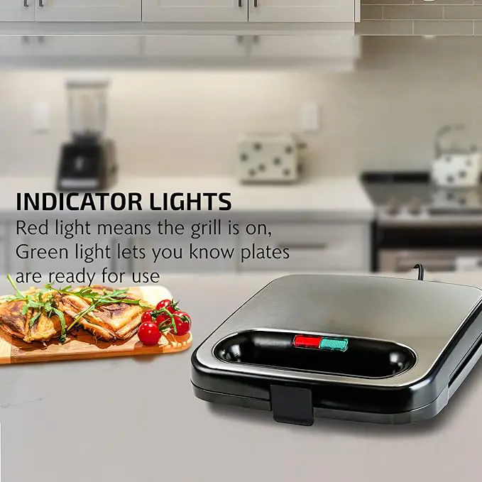 What sets this wholesale sandwich maker apart is its thoughtful construction. The heat-resistant housing, cool-touch locking handle, and anti-skid feet enhance safety during use. With ready and power indicator lights, users get clear signals for operation status. The upright storage capability helps save space in inventory or in end-users’ compact kitchens, maximizing value per square inch—ideal for bulk distribution in space-saving kitchen solutions.