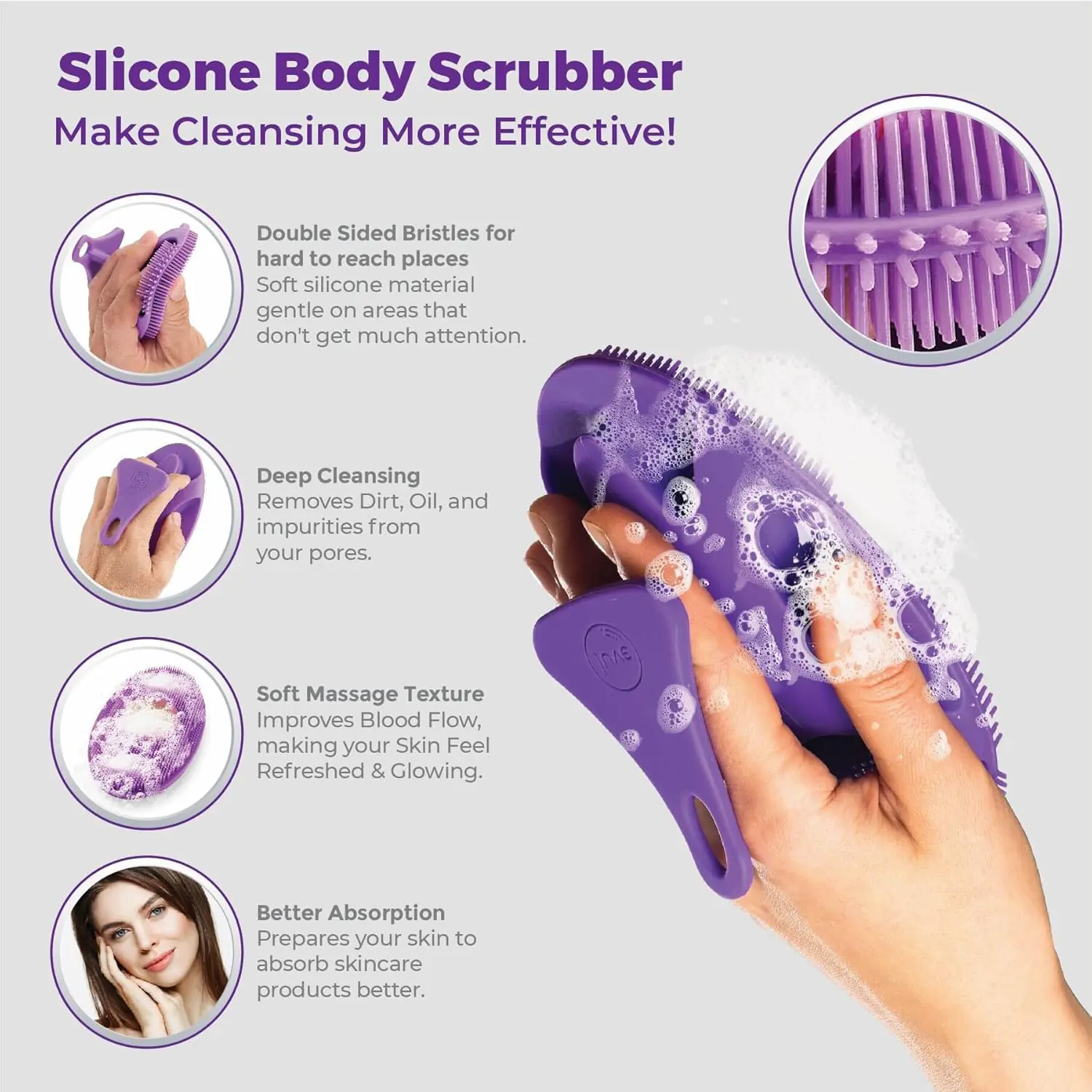 Crafted from premium-grade silicone, this wholesale silicone shower scrubber features double-sided bristles for multi-zone use and a patented center soap reservoir for optimal lathering. Ergonomically grooved for a secure grip, it allows precise control during use. Durable, fast-drying, and non-porous, it resists mold and ensures long-lasting hygiene performance.