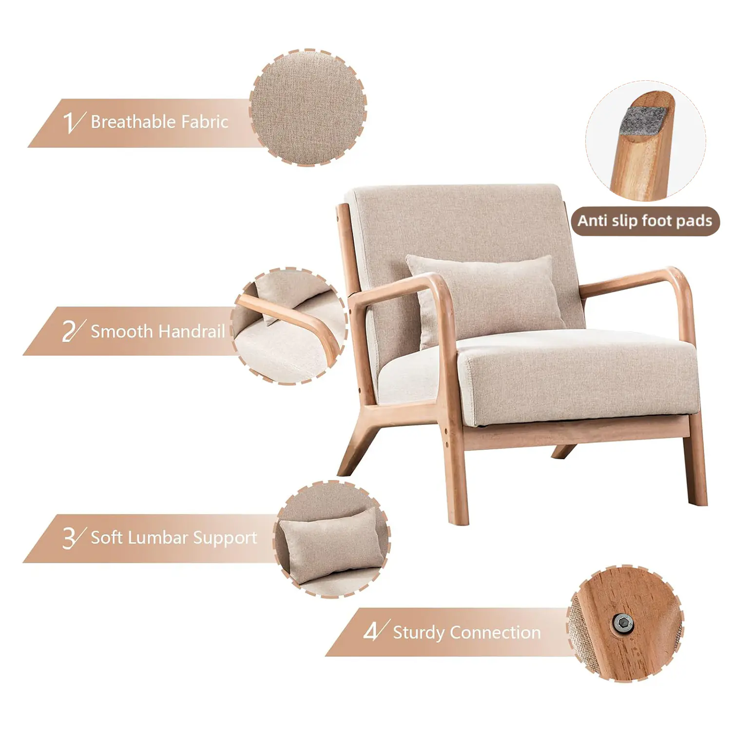 The Wholesale Single Upholstered Chair is designed with a mid-century modern aesthetic, featuring a solid wood frame and high-density sponge filling. Its compact size and comfortable design make it suitable for living rooms, bedrooms, lounges, or sunrooms. Retailers and distributors will find it an appealing product that combines style and function for diverse customer needs.