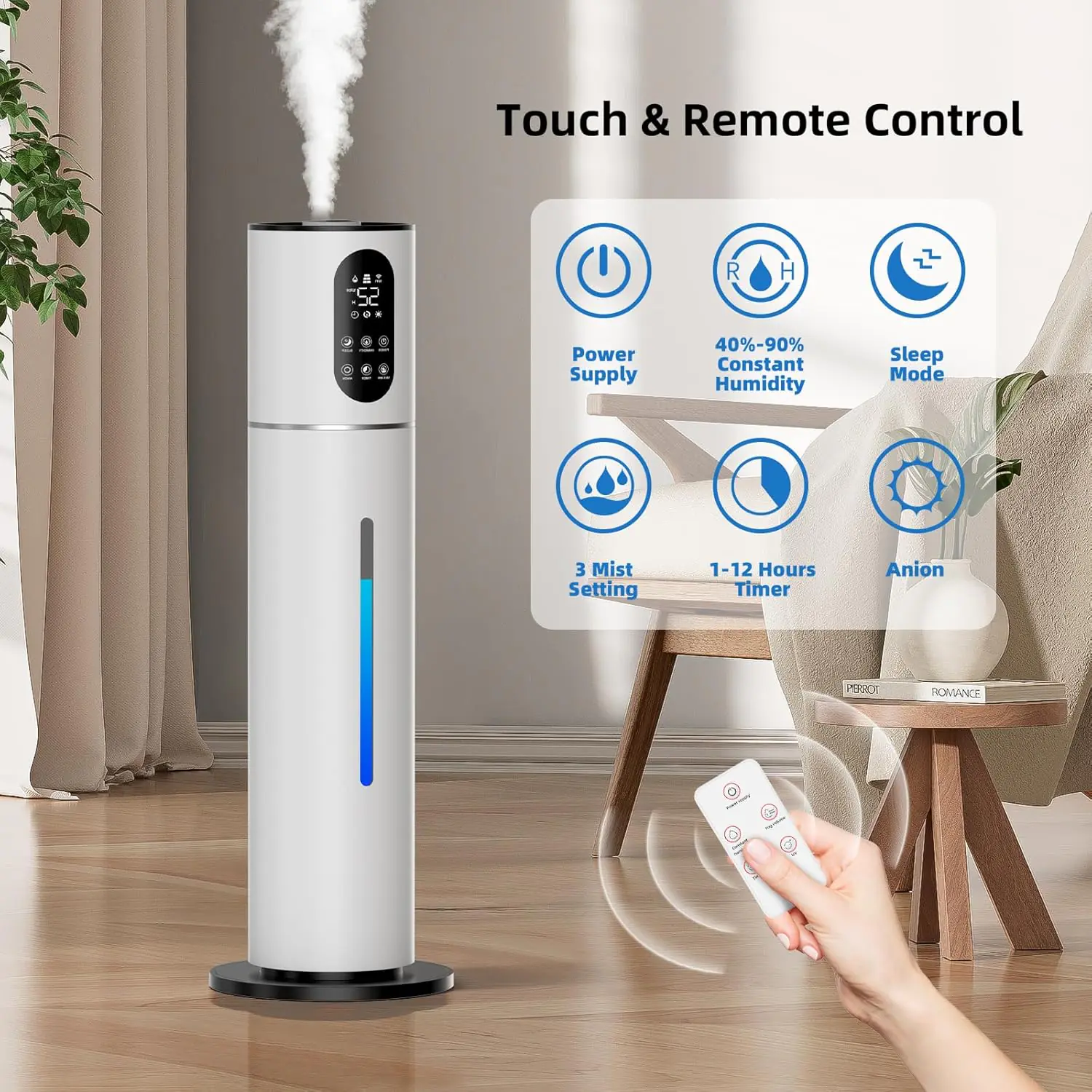 The Wholesale Smart Humidifier with an 8L (2.1-gallon) tank provides up to 40 hours of continuous cool mist, covering areas up to 500 sq. ft. With top-fill design and anti-leak structure, it ensures simple refilling and reliable performance. Designed for bedrooms, offices, and living spaces, it helps relieve dryness, balance humidity, and improve air quality year-round.