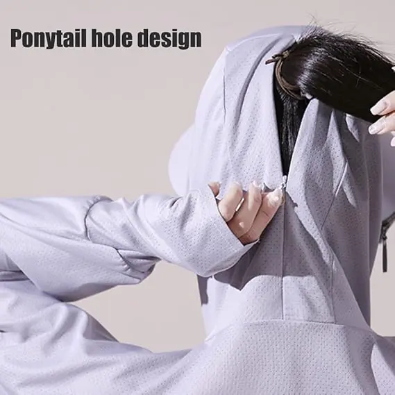 The wholesale sun protection jacket stands out with thoughtful design details that combine style and protection. Thumbholes extend sleeve coverage to the hands, while a ponytail hole at the back enhances ventilation and comfort. The loose fit flatters various body shapes and pairs effortlessly with activewear or casual outfits. Engineered for full UV protection, insect prevention, and quick moisture evaporation, this jacket ensures practicality and appeal for customers who value functionality and trend-forward performance wear.