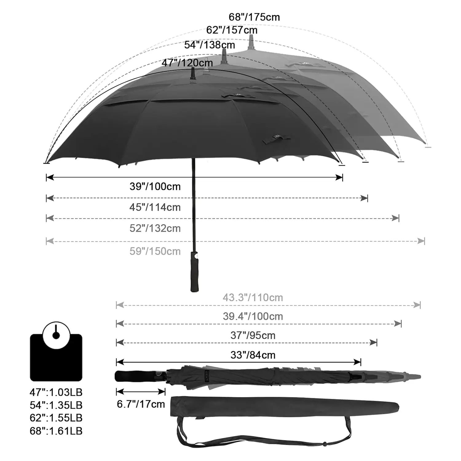 This wholesale sun protection umbrella is designed for professional, leisure, and everyday use, providing superior coverage with canopies ranging from 47 to 68 inches. Crafted from ultra-water-resistant 210T pongee fabric with SPF 50+ UV protection, it ensures dependable shelter from rain, wind, and sun. Its automatic open feature and ergonomic EVA handle make it convenient for users on the go. Ideal for golfers, commuters, and outdoor enthusiasts, this umbrella delivers both style and function in all weather conditions.