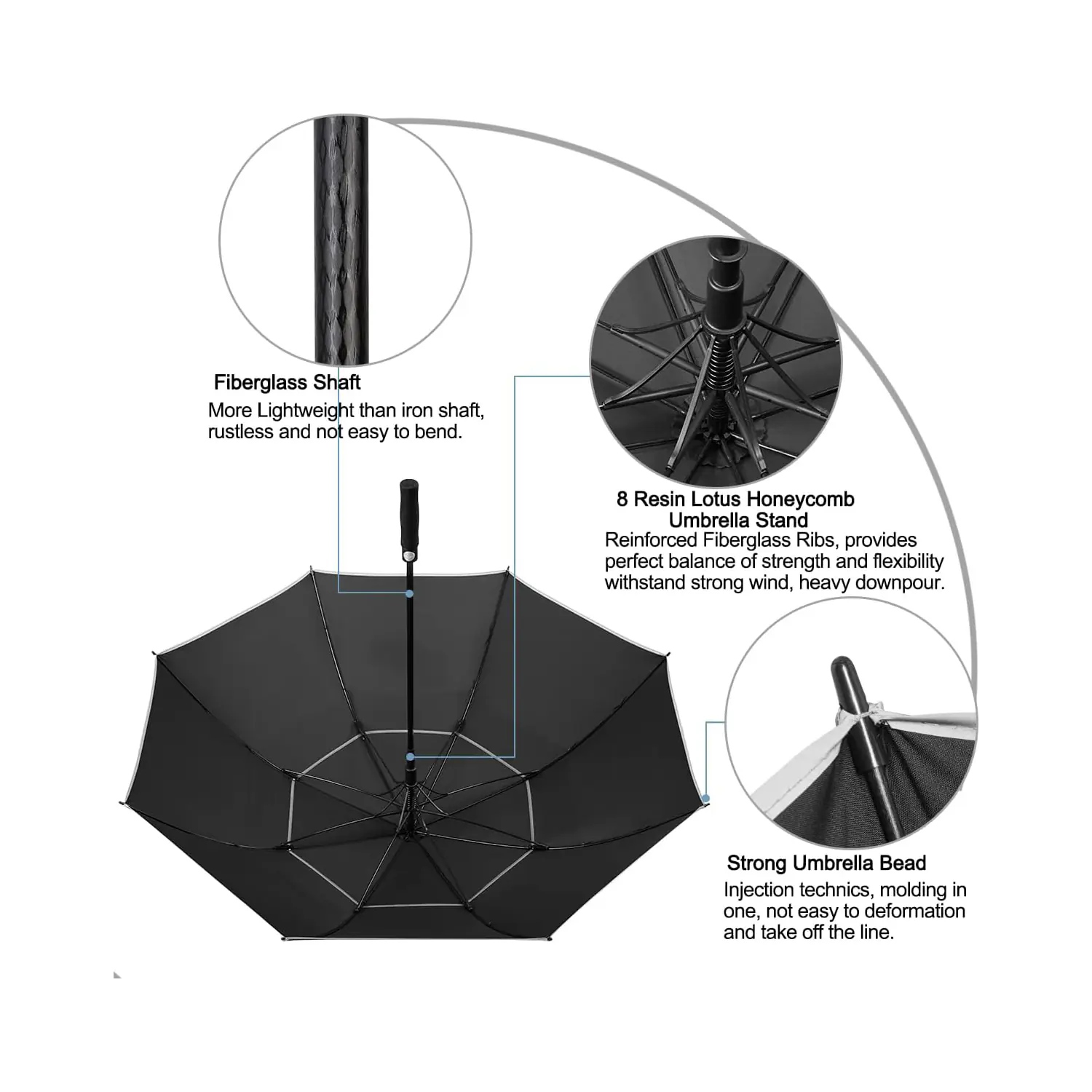 Engineered with a double-canopy vented design and fiberglass frame, this wholesale sun protection umbrella stands virtually windproof, ensuring stability even in harsh weather. The durable construction, reinforced ribs, and high-stitch-density canopy enhance longevity, reducing replacements for wholesale buyers. Its elegant, minimalist design appeals to both business professionals and sports users, making it an excellent choice for distributors seeking premium-quality umbrellas that combine performance, durability, and modern aesthetics.