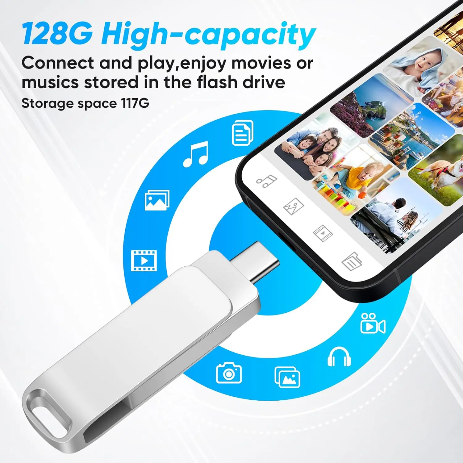 The Wholesale USB Drive with 128G storage and USB 3.0 technology provides fast data transfer and secure storage. Featuring dual USB and Type-C connectors, it enables quick file sharing across laptops, desktops, tablets, and smartphones. Ideal for wholesale buyers supplying digital storage solutions.