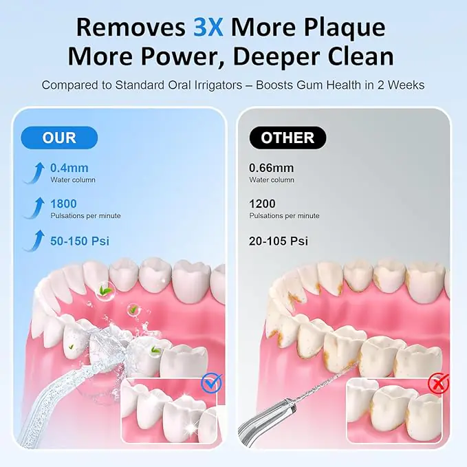 Equipped with 0.4mm precision jet tips, this Wholesale Water Flosser provides deeper cleaning than traditional floss. Adjustable water pressure (60–120 PSI) ensures comfort for sensitive gums, braces, or implants. The USB-C fast charging battery lasts up to 30 days, while the ergonomic anti-slip design guarantees ease of use. Its durability and performance make it a strong choice for wholesale distributors in the oral care sector.