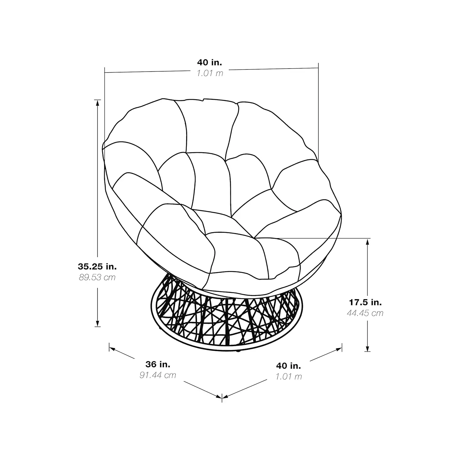 Crafted with a durable resin wicker exterior over a sturdy metal frame, this Wicker Papasan Chair ensures long-term use. The ultra-soft, button-tufted Dacron cushion adds visual appeal and ergonomic support, while the frictionless swivel allows for smooth, effortless movement in any direction.